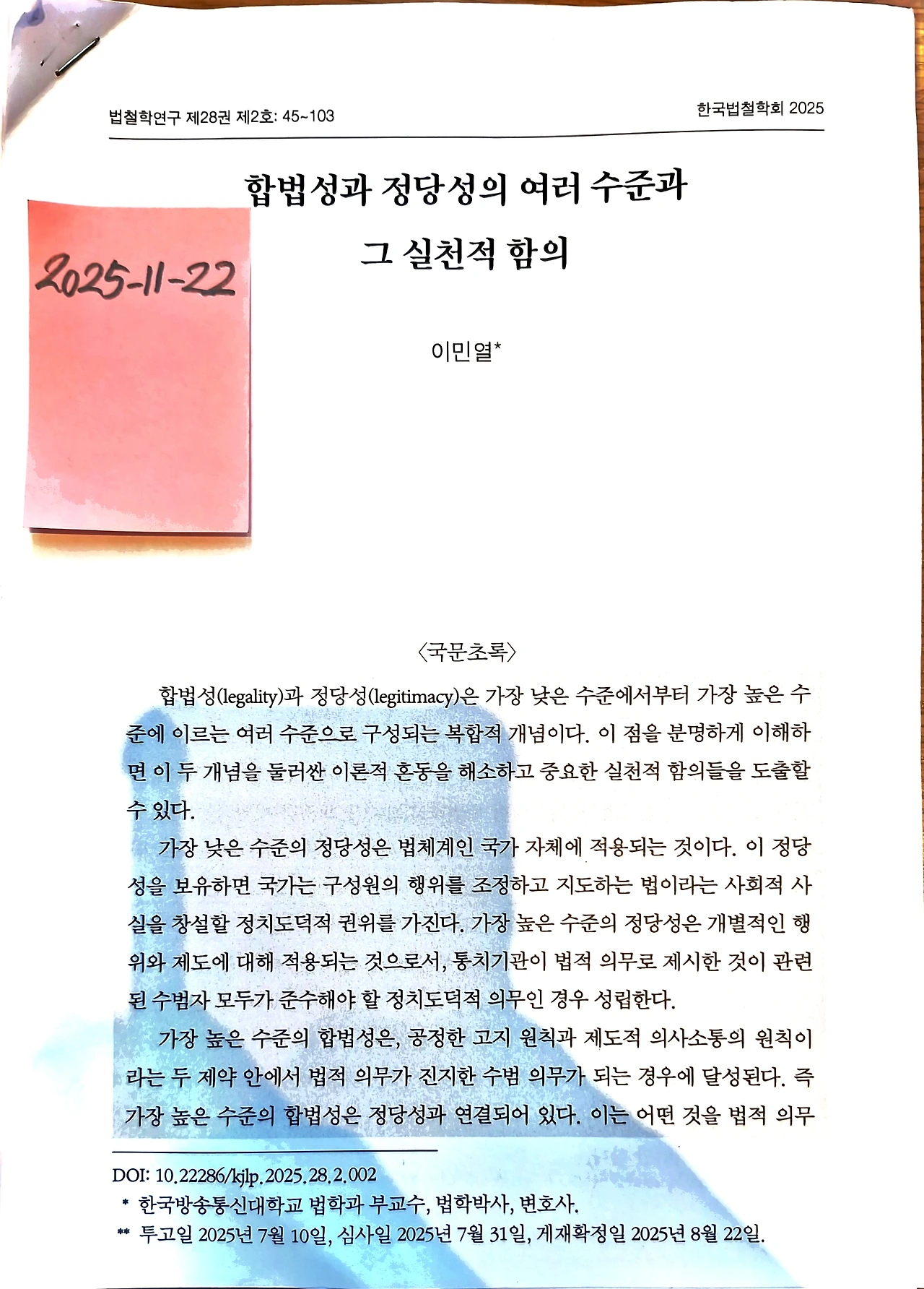 이민열, 《합법성과 정당성의 여러 수준과 그 실천적 함의》, 한국법철학회, 『법철학연구』 제28권 제2호, 2025. 8., 45-103면