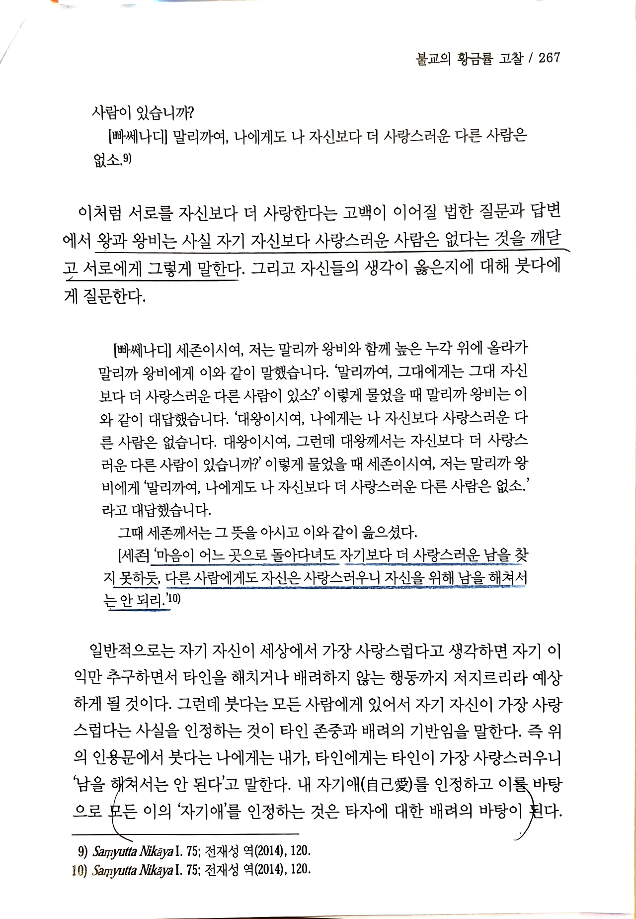 붓다는 "자신보다 더 사랑스러운 사람은 없다"는 인간의 근원적 자기애를 부정하지 않고 긍정하는바, 이때 중요한 것은 이러한 자기애를 타인에게로 투사하는 추론 과정이다. "나에게 생명이 소중하고 고통이 싫다면, 타인에게도 역시 그러할 것이다." 이러한 통찰은 타인을 해치지 않는 소극적 황금률(Negative Golden Rule)의 기초가 된다. 맹목적인 자기희생을 강요하는 것이 아니라, 건전한 자기 존중이 타인 존중의 전제조건임을 시사한다. 자기를 사랑할 줄 모르는 자는 타인도 사랑할 수 없다는 것이다.