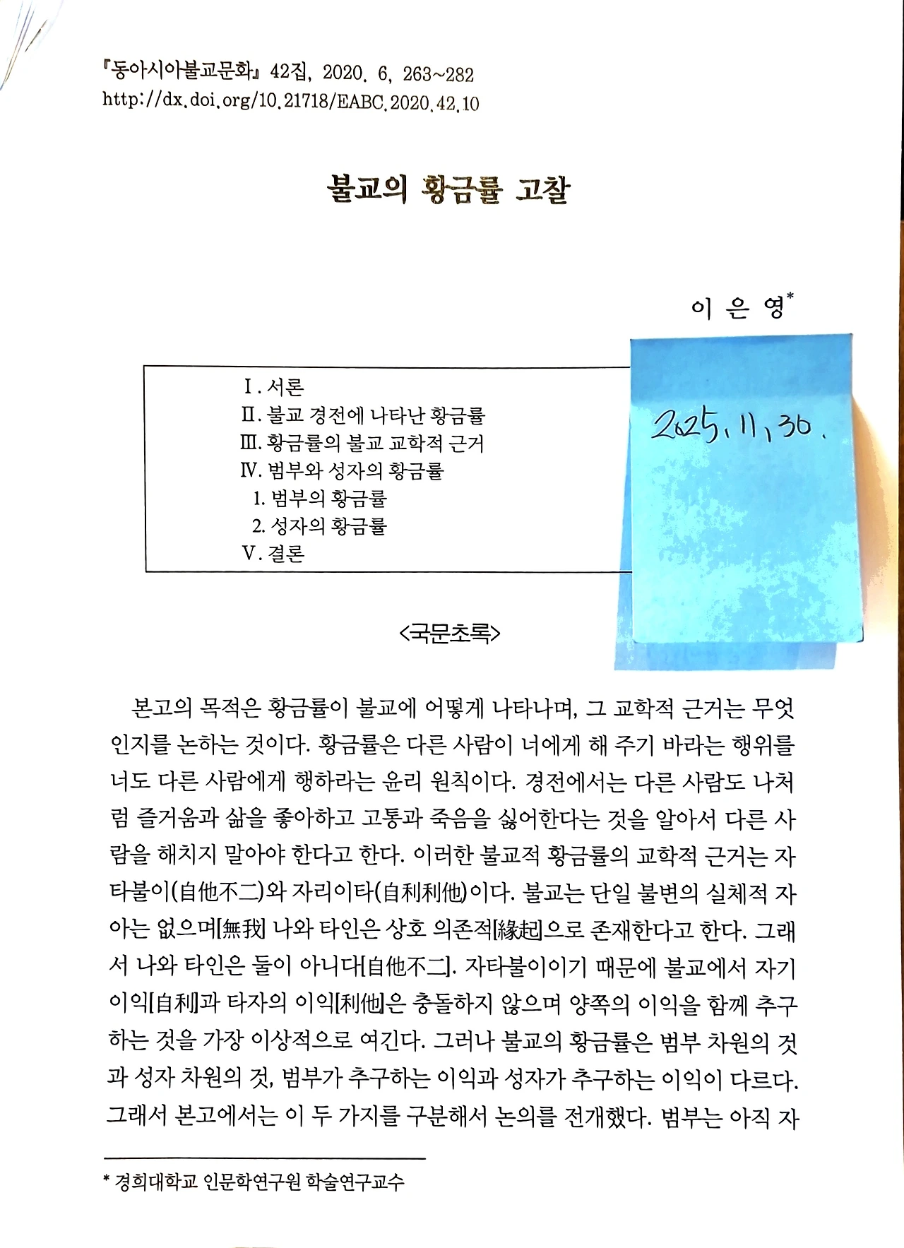 이은영, 《불교의 황금률 고찰》, 동아시아불교문화학회, 『동아시아불교문화』제42집, 2020. 6., 263-282면