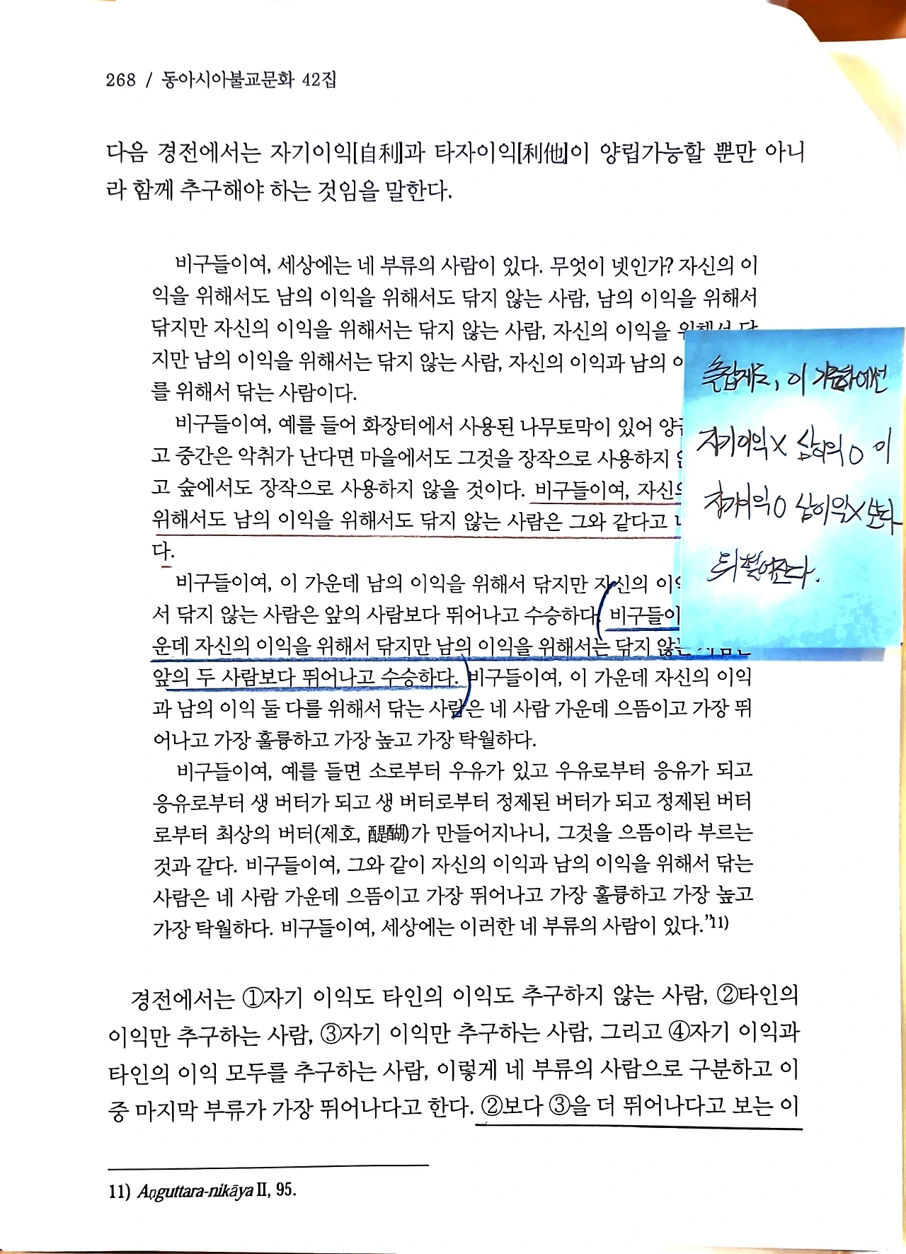 자타구리(自他俱利)의 이상이자 두번째 단계에선 자신의 이익과 타인의 이익을 동시에 추구하는 '자타구리'를 최상의 덕목으로 제시한다. 『앙굿따라 니까야』는 인간 유형을 네 가지로 분류한다.