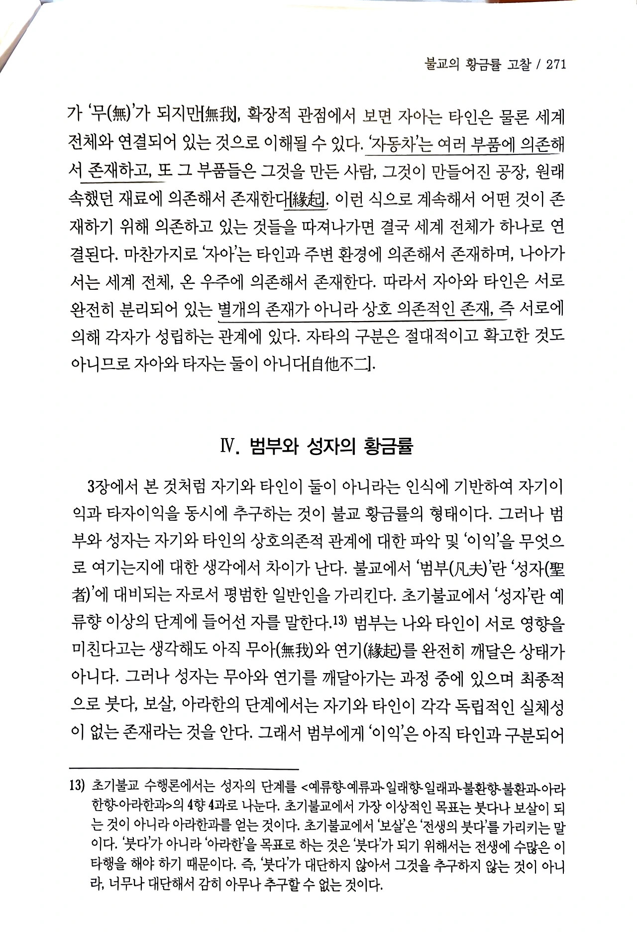 혹자는, 무아(無我)라는 이름에서 일견 허무주의로서 자기소실로 해석할 수도 있다. 그러나 불교의 무아론은 자아의 허무한 소멸을 의미하는 것이 아니라, 고정된 실체로서의 자아를 부정함으로써 역설적으로 자아를 세계 전체로 확장하는 것이다.