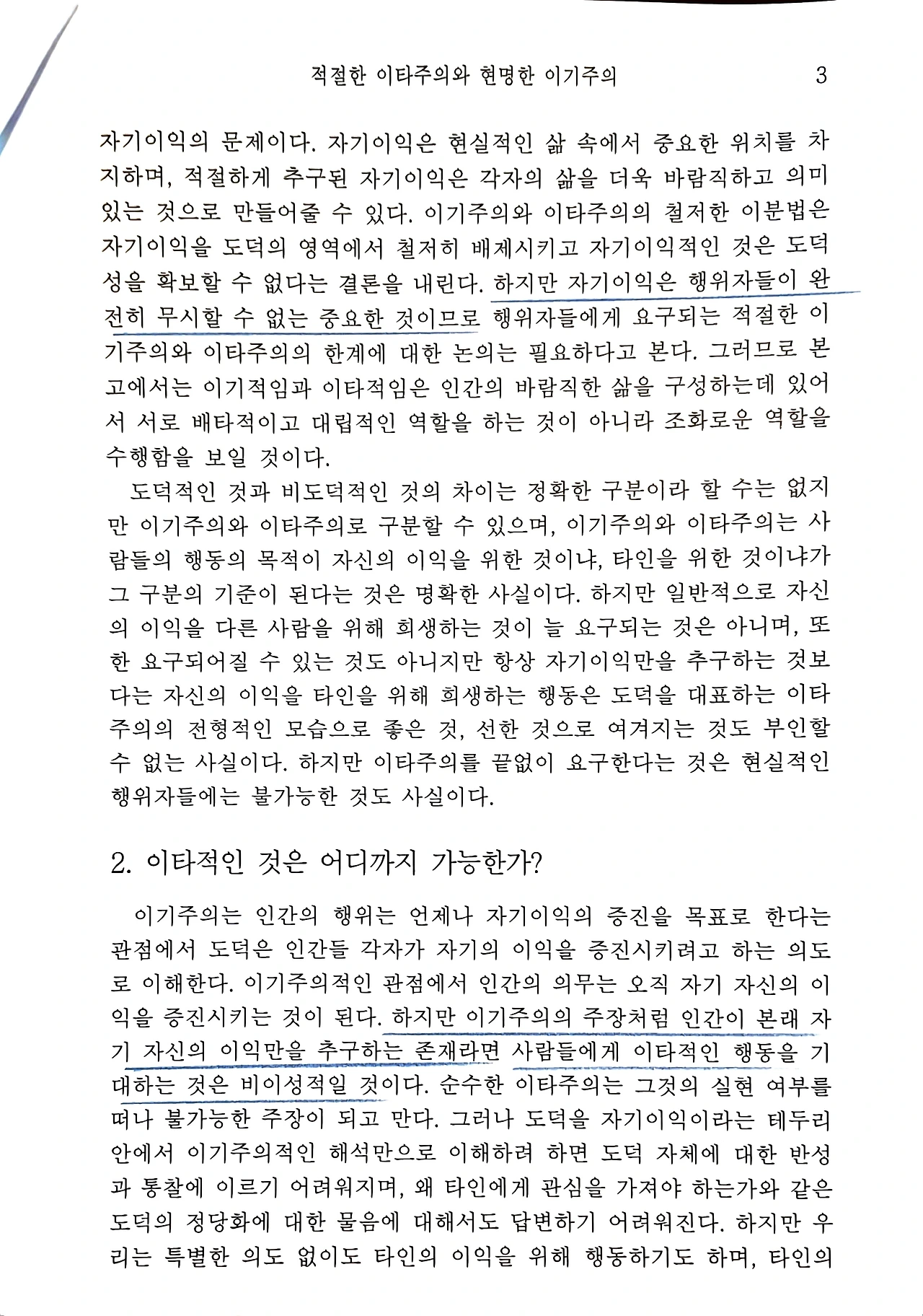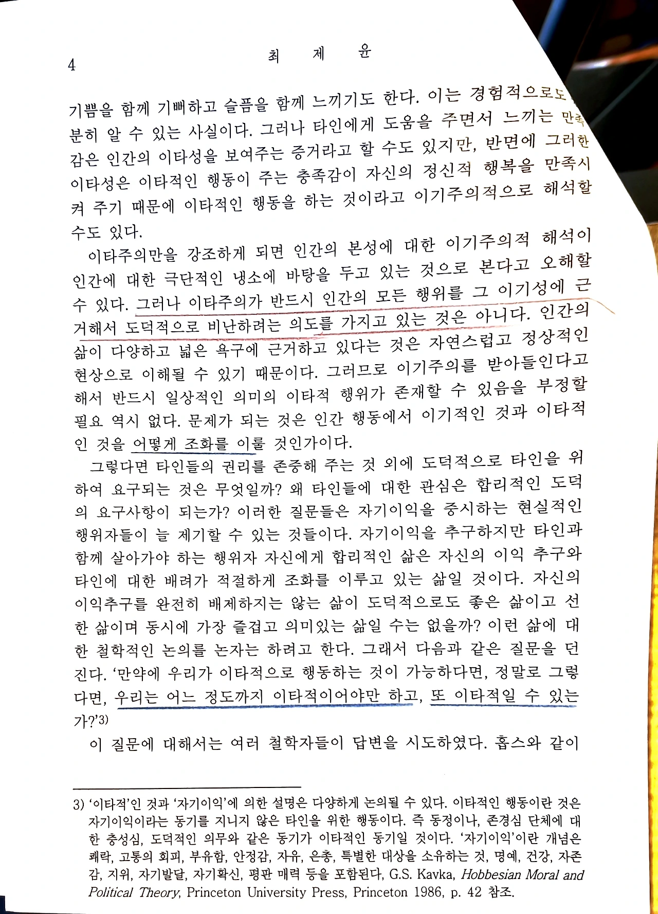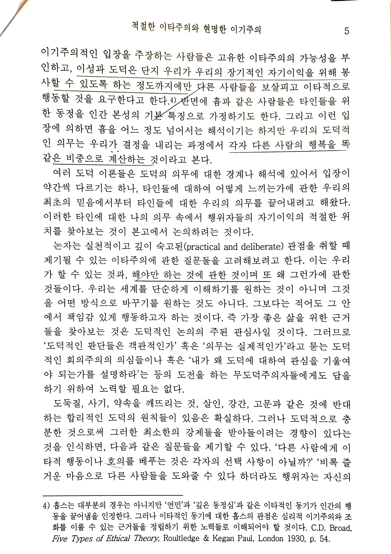 인류의 지성사는 오랫동안 '나(自)'와 '남(他)'이라는 두 실체 간의 관계를 규명하는 데 골몰해 왔다. 서구의 근대 윤리학, 특히 홉스로 대변되는 이기주의적 인간관과 칸트로 대표되는 의무론적 이타주의는 인간의 행위 동기를 자기이익과 타인이익이라는 대립적인 축으로 양분하였다.