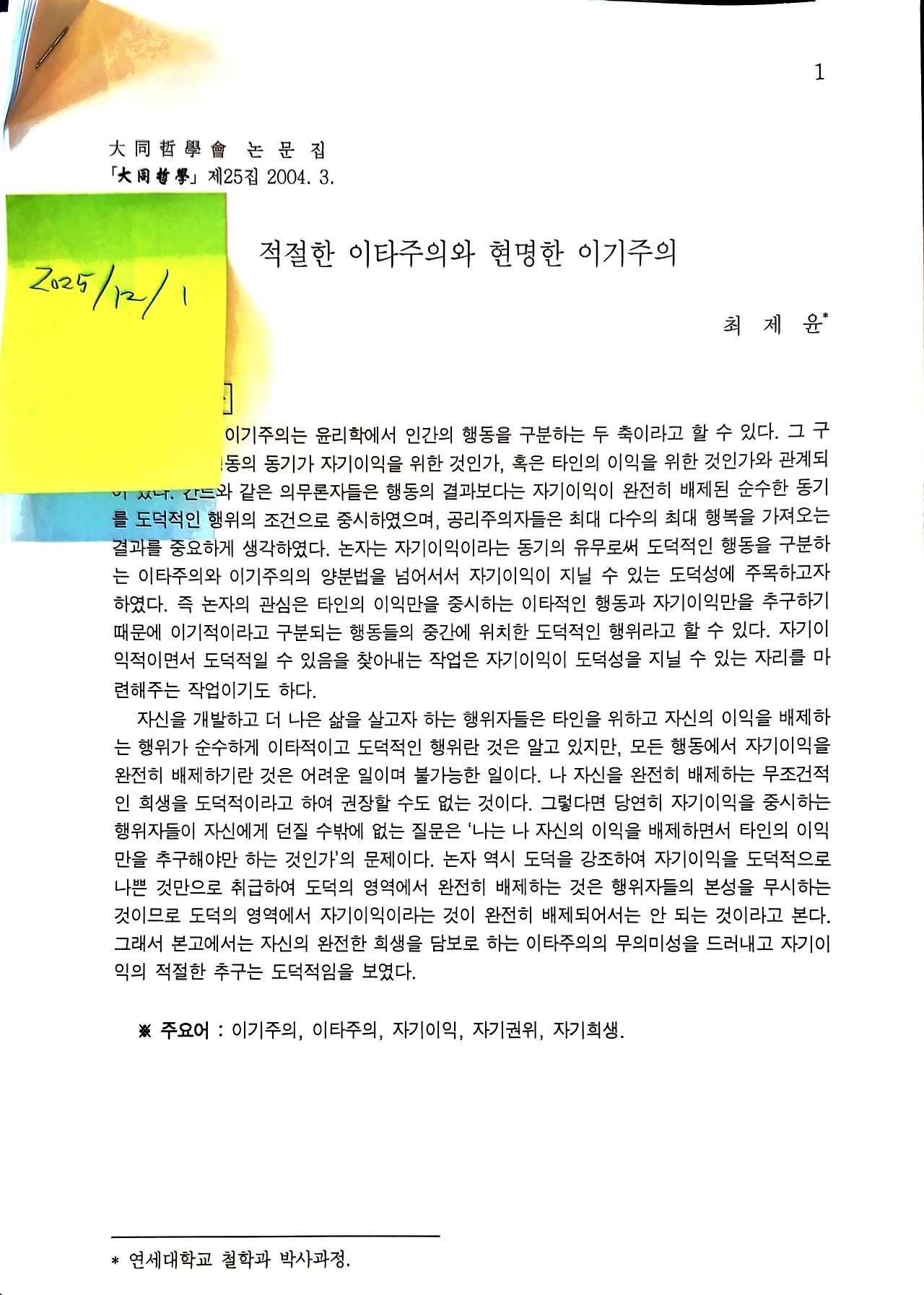 최제윤, 《적절한 이타주의와 현명한 이기주의》, 대동철학회, 『대동철학』제25호, 2004, 3., 233-256면