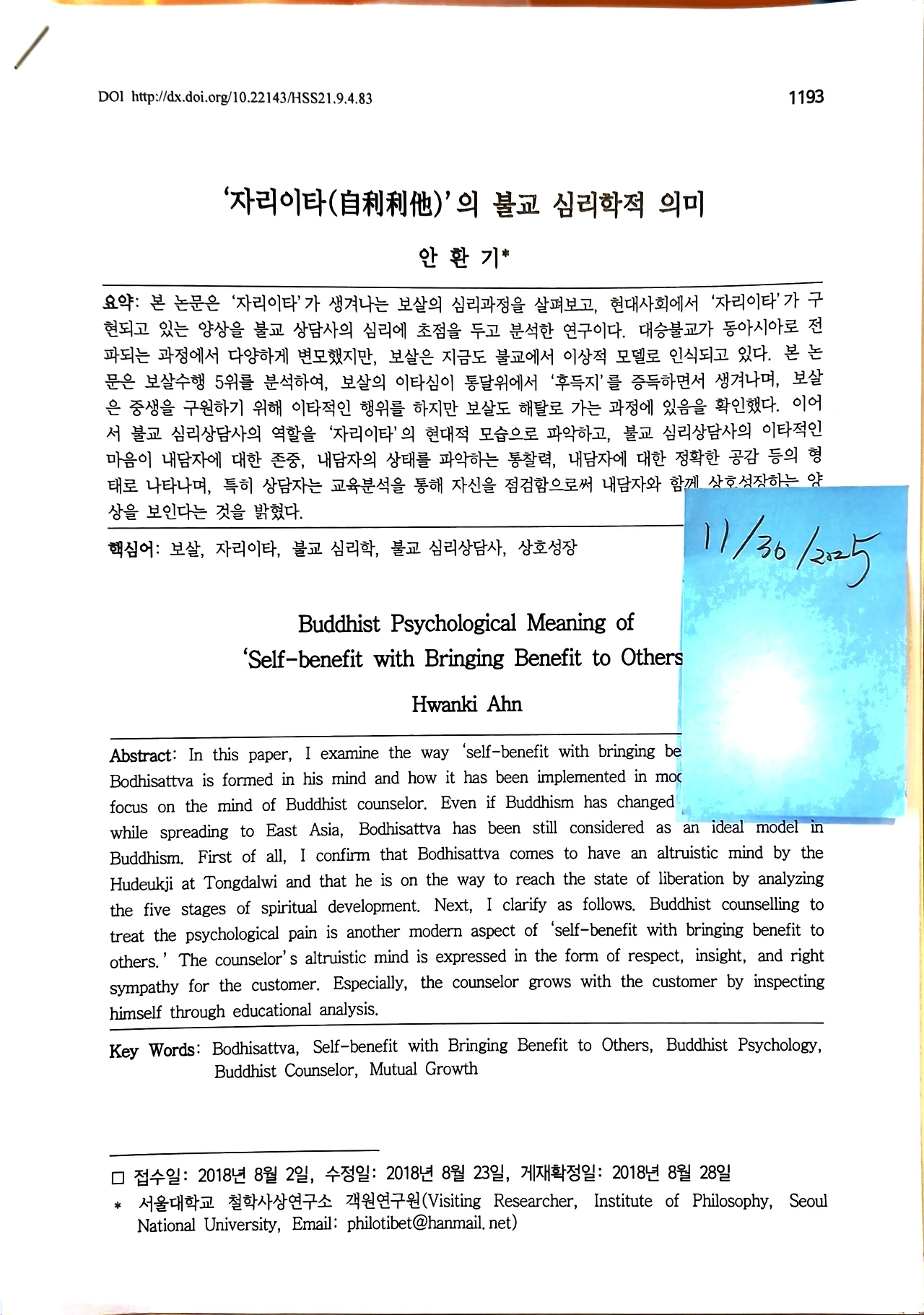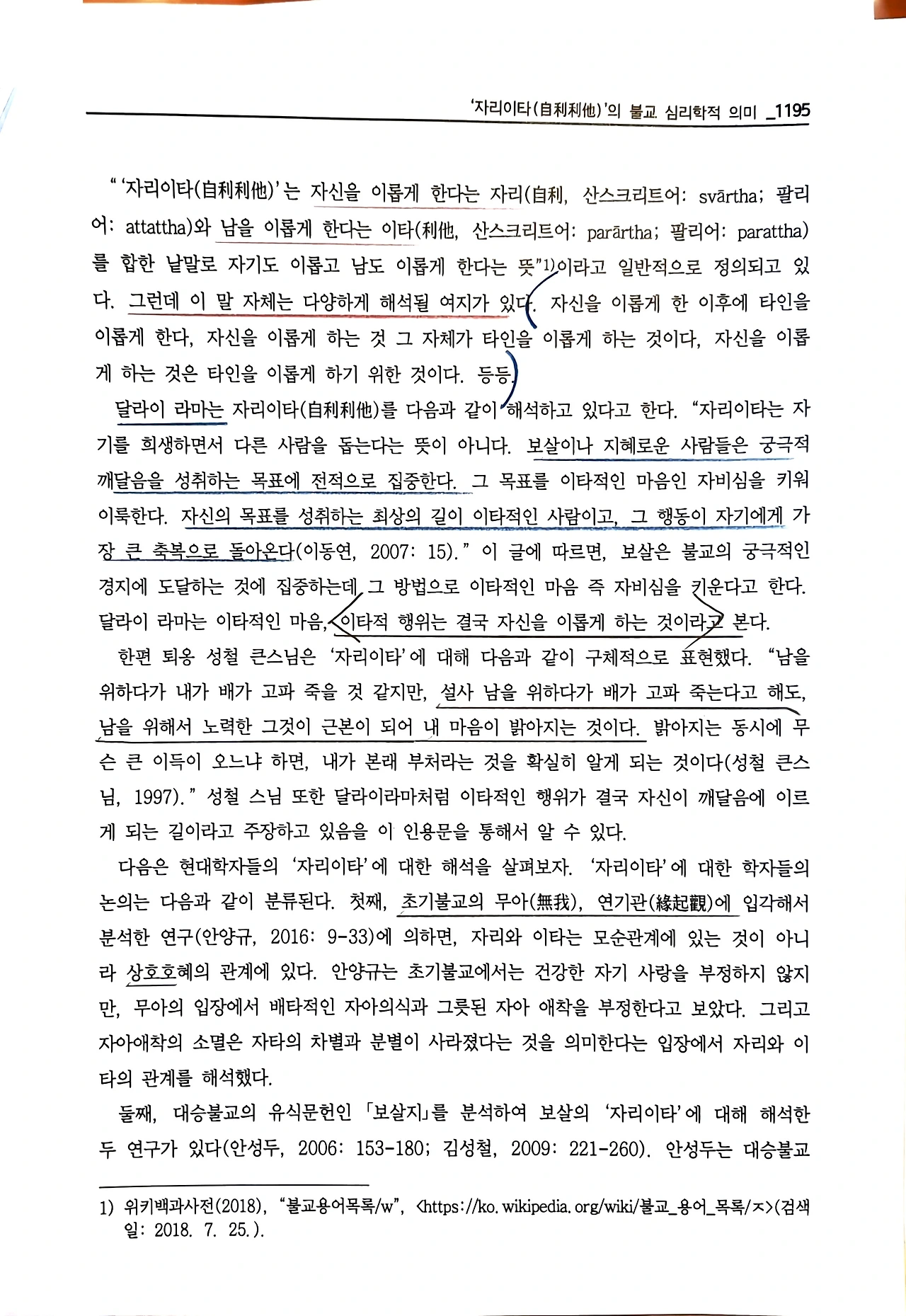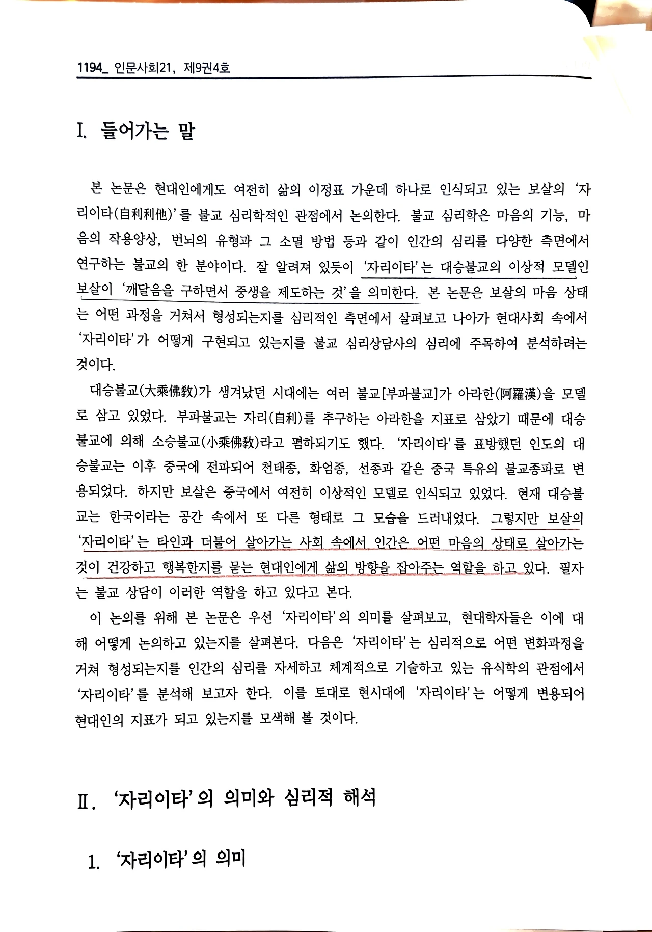 안환기, 《자리이타의 불교 심리학적 의미》, 인문사회21, 『인문사회 21』제9권 제4호, 2018. 8., 1193-1206면