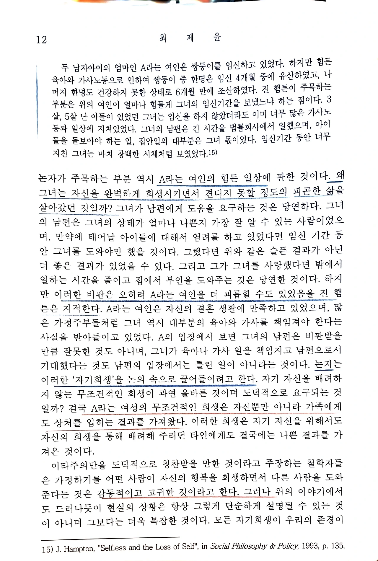진 햄튼(Jean Hampton)이 제시한 '어머니 A'의 사례는 무조건적 희생의 위험성을 경고한다. A는 가족을 위해 자신의 모든 욕구와 건강을 희생하지만, 결과적으로 자신은 피폐해지고 가족에게도 죄책감이나 부담을 안겨주게 된다. 불교적 관점에서 볼 때, 자신을 학대하거나 소외시키는 희생은 올바른 자비가 아니다. 오히려 자아에 대한 다른 형태의 무지이며, 자신을 '타인의 목적을 위한 수단'으로 전락시키는 행위이다. 자신의 불성(佛性)을 존중하지 않는 태도는 장기적으로 지속 가능한 이타행을 불가능하게 한다.