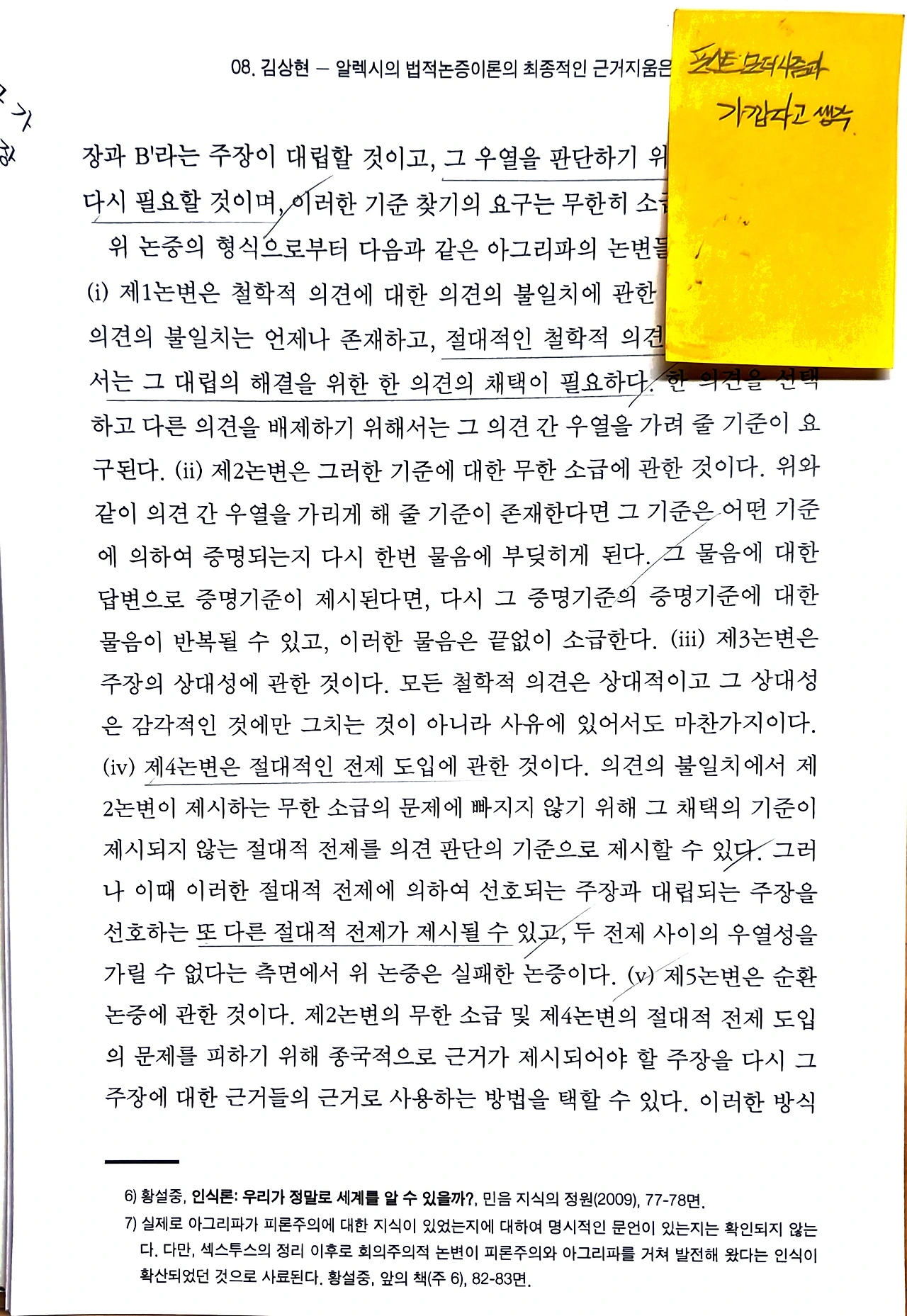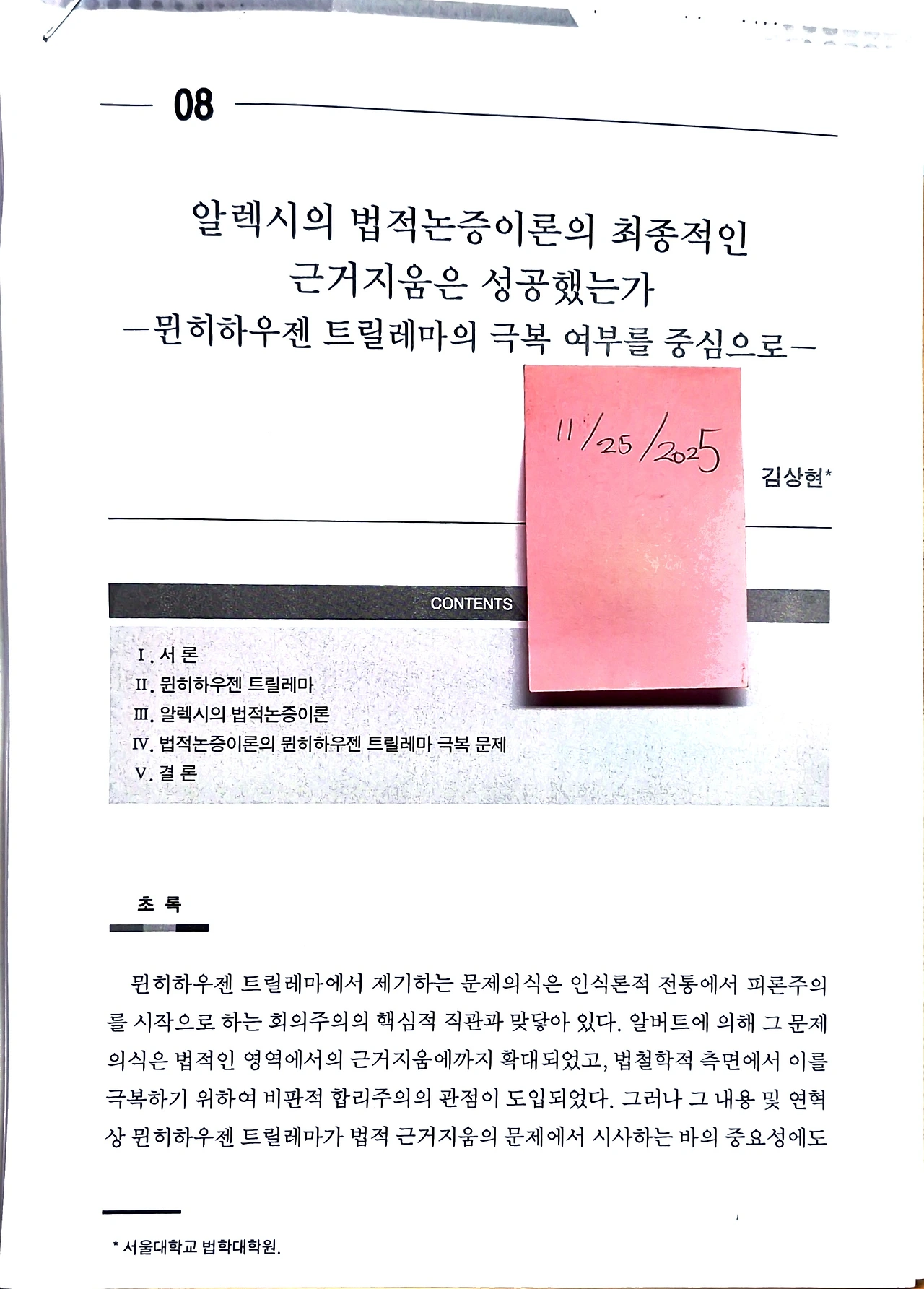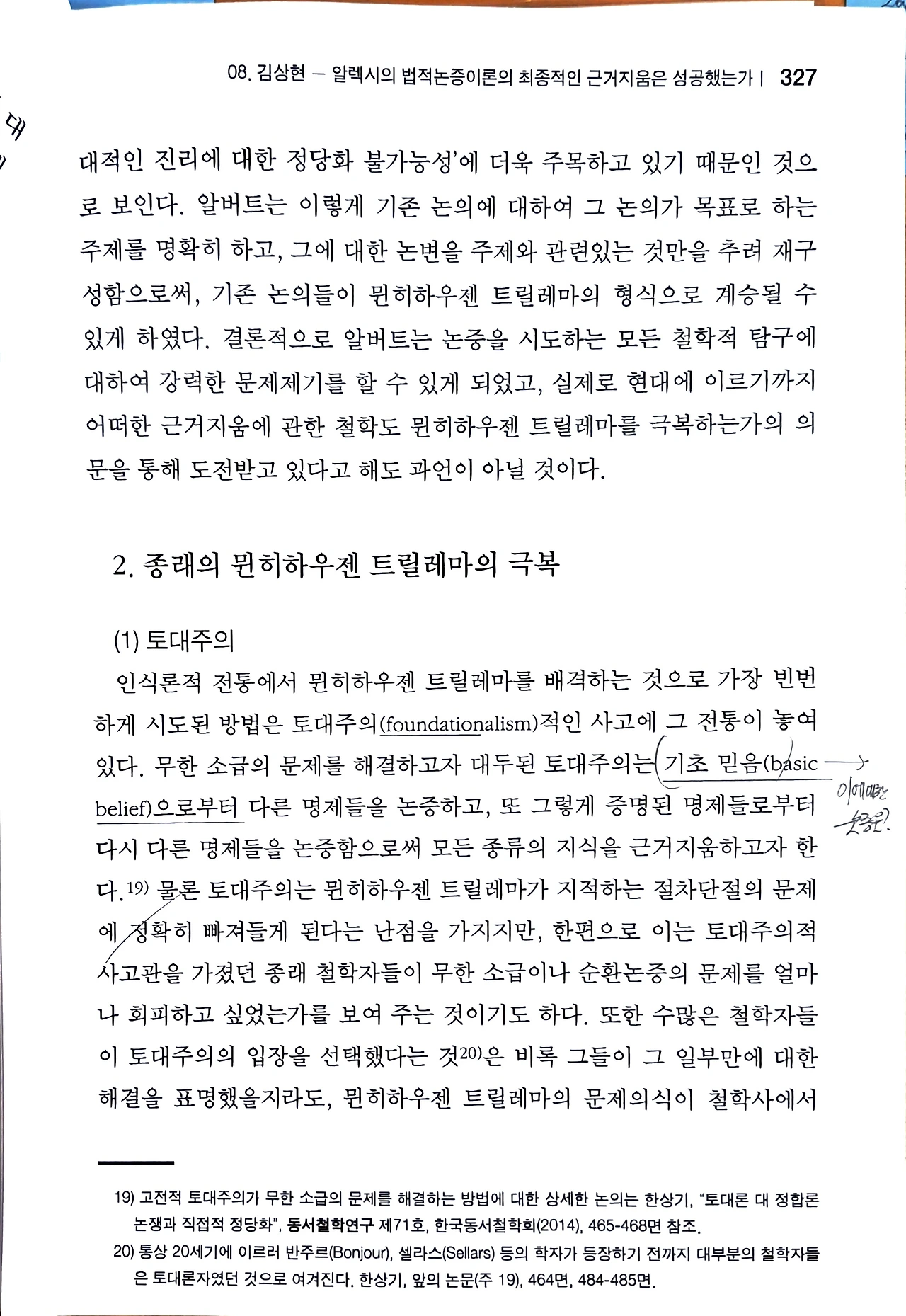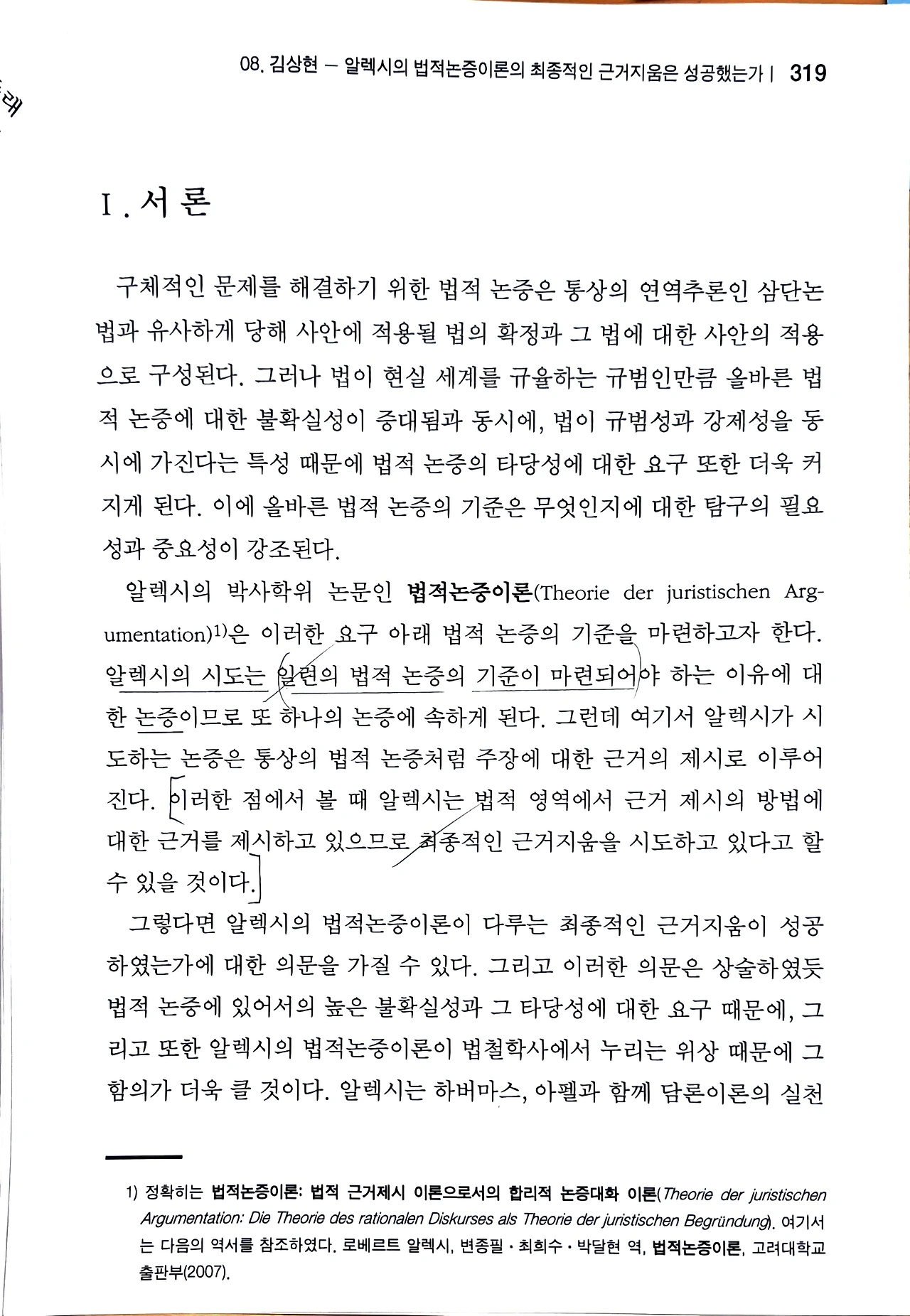 김상현, 《알렉시의 법적논증이론의 최종적인 근거지움은 성공했는가-뮌히하우젠 트릴레마의 극복 여부를 중심으로》, 서울대학교 법학연구소 법이론연구센터, 『기초법학연구』 제2호, 2022. 6., 317-360면