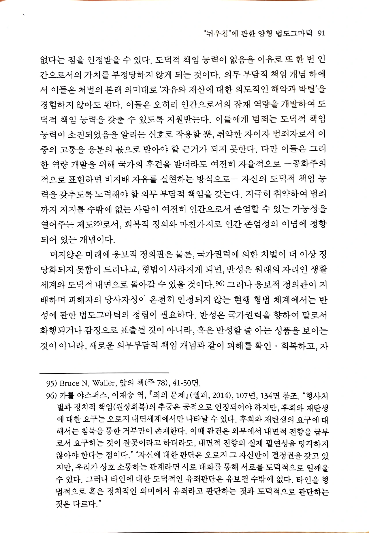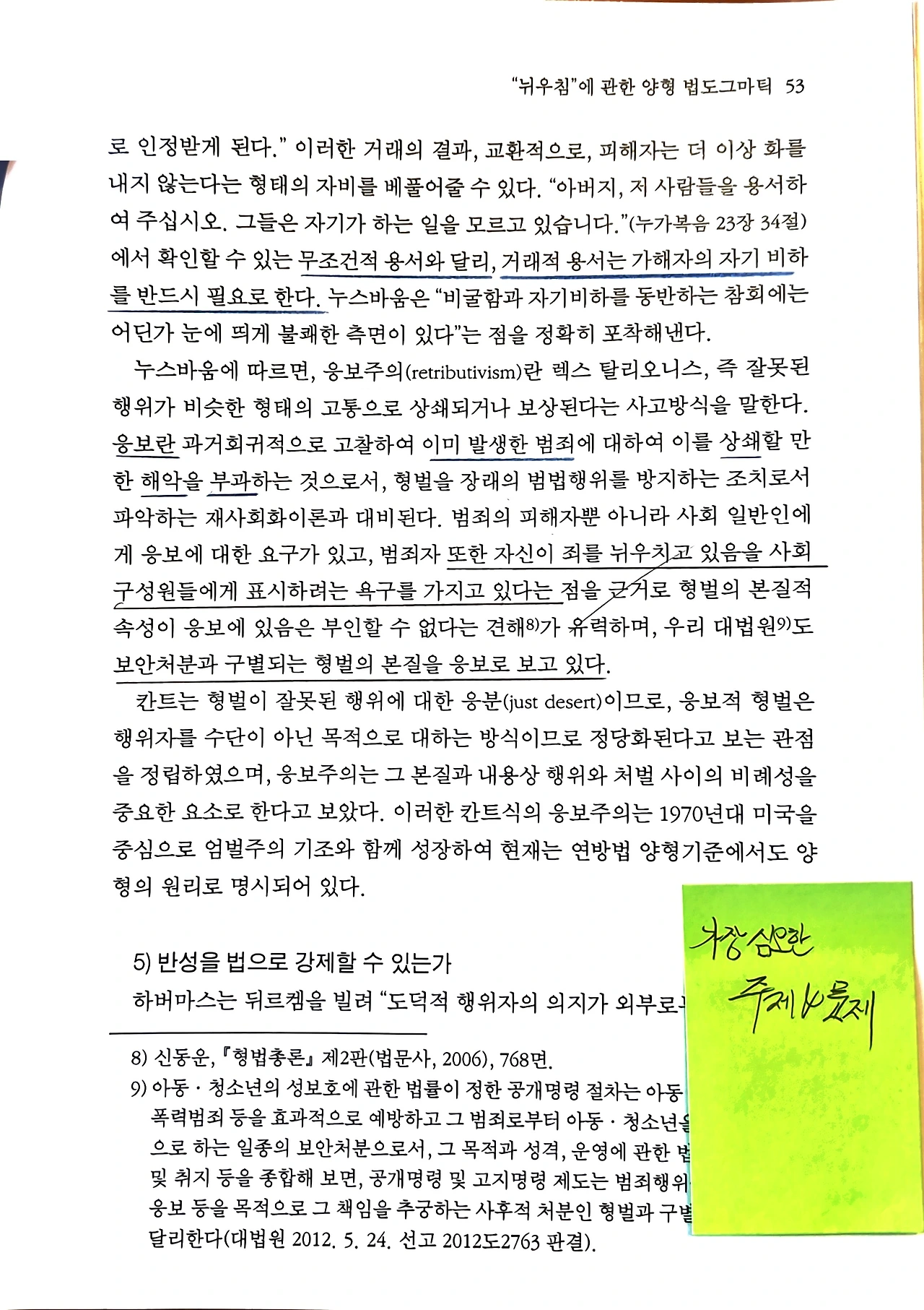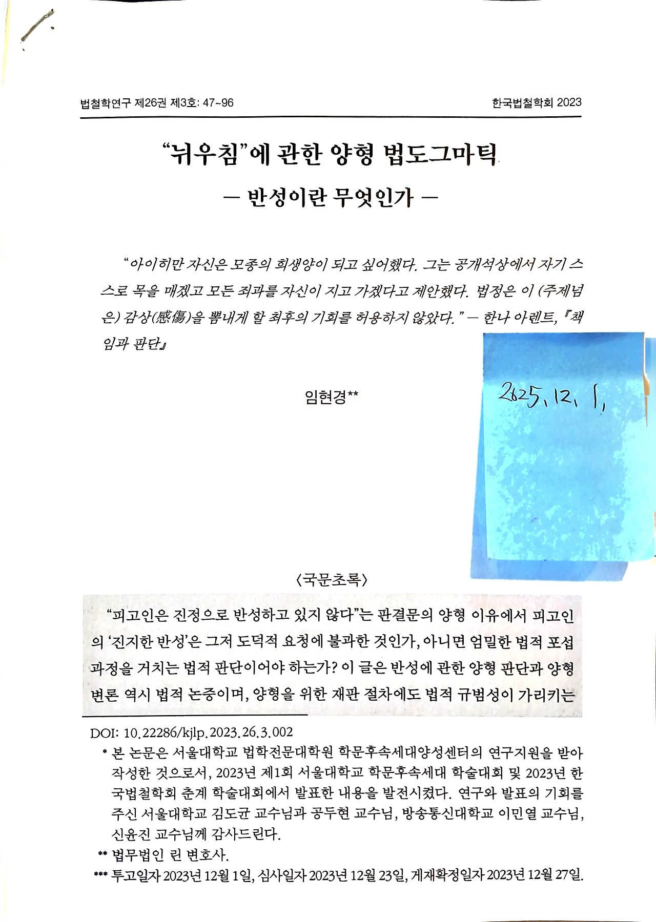 임현경, 《"뉘우침"에 관한 양형 법도그마틱- 반성이란 무엇인가》, 한국법철학회, 『법철학연구』 제26권 제3호, 2023. 12., 47-96면