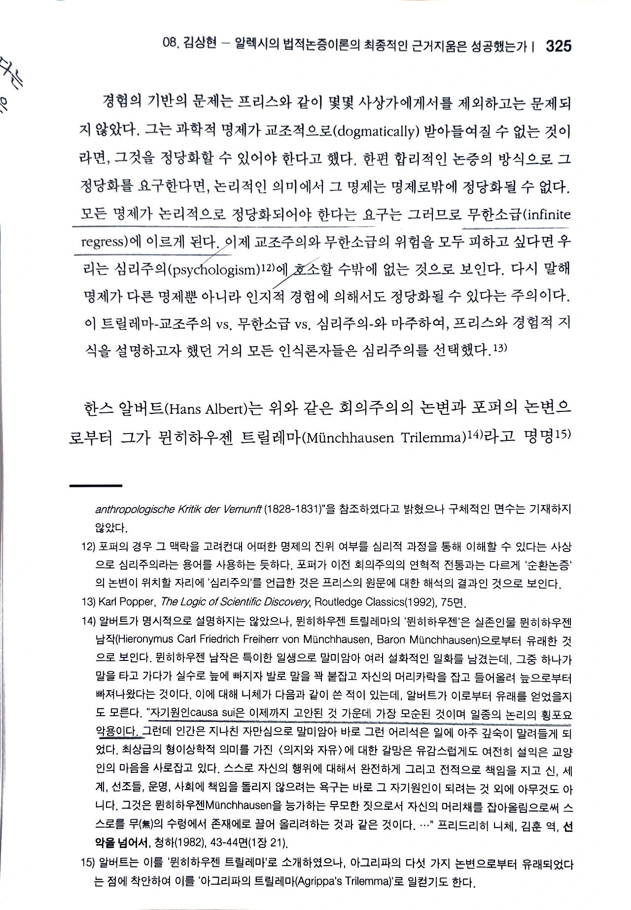 김상현의 연구에 따르면, 이러한 근거지움의 문제는 알베르트(Hans Albert)가 정식화한 '뮌히하우젠 트릴레마(Münchhausen Trilemma)'라는 인식론적 난제에 봉착하게 된다. 이는 피론주의(Pyrrhonism)와 아그리파(Agrippa)의 다섯 가지 논변에서 유래한 것으로, 어떤 명제를 절대적으로 정당화하려 할 때 필연적으로 다음 세 가지 곤경 중 하나에 빠진다는 것이다.