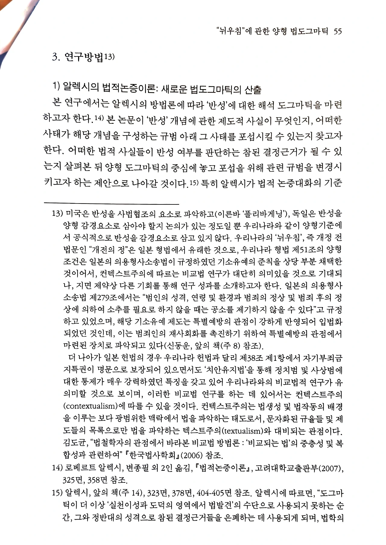 이를 해결하기 위한 첫걸음으로 본고는 두 가지 핵심적인 연구 성과를 분석하고 통합하고자 한다. 하나는 임현경의 연구 「"뉘우침"에 관한 양형 법도그마틱」으로, 현행 양형 실무에서 감정적 차원으로 치부되는 반성의 문제를 비판하고 '의무부담적 책임'과 '의사소통행위'로서의 반성 개념을 제안한다. 다른 하나는 김상현의 연구 「알렉시의 법적논증이론의 최종적인 근거지움은 성공했는가」로, 이는 알베르트(Hans Albert)가 제기한 인식론적 난제인 '뮌히하우젠 트릴레마(Münchhausen Trilemma)'를 로베르트 알렉시(Robert Alexy)가 어떻게 '합리적 논증대화 이론'을 통해 극복하려 했는지를 규명한다.