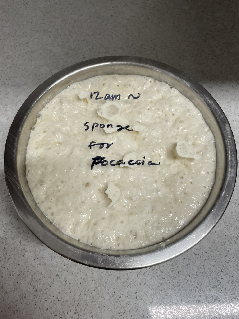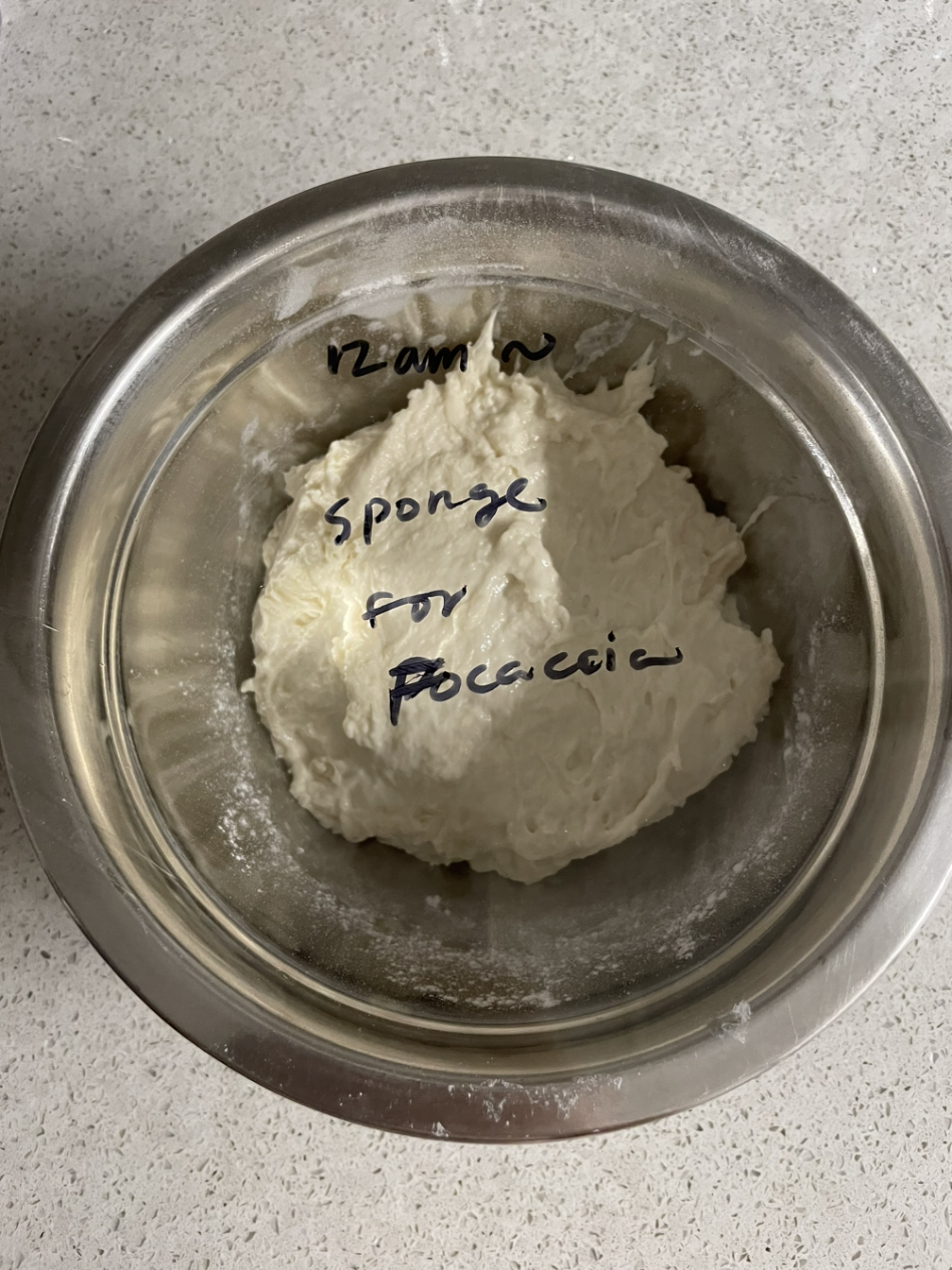 포카치아를 만드는 데에 스펀지(사전반죽)를 활용했다. 재료가 심플한 하드계열 발효빵을 만들 때는 가능하면 배합의 일부를 8-16시간 전에 미리 반죽해 두었다가 본반죽에 활용하는 사전반죽법을 쓴다. 아직 나도 사전반죽의 원리에 대해 명료하게 설명할 만큼 이론지식이 풍부하진 않지만 경험상 사전반죽을 통해 상업용 이스트의 양을 최소화하고 발효시간을 최대한 늘리면 빵의 질감과 풍미가 크게 개선되는 것을 확인했다.