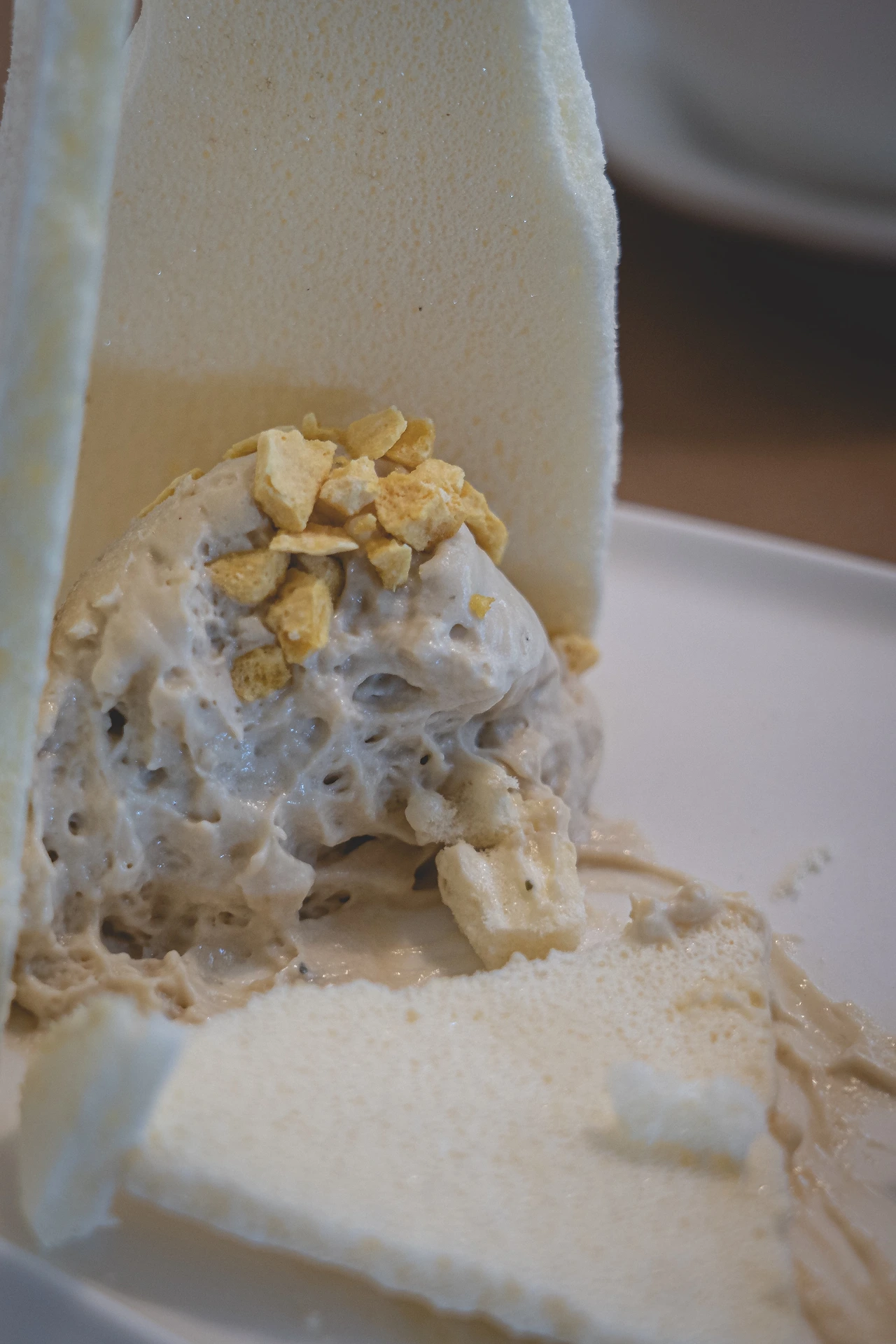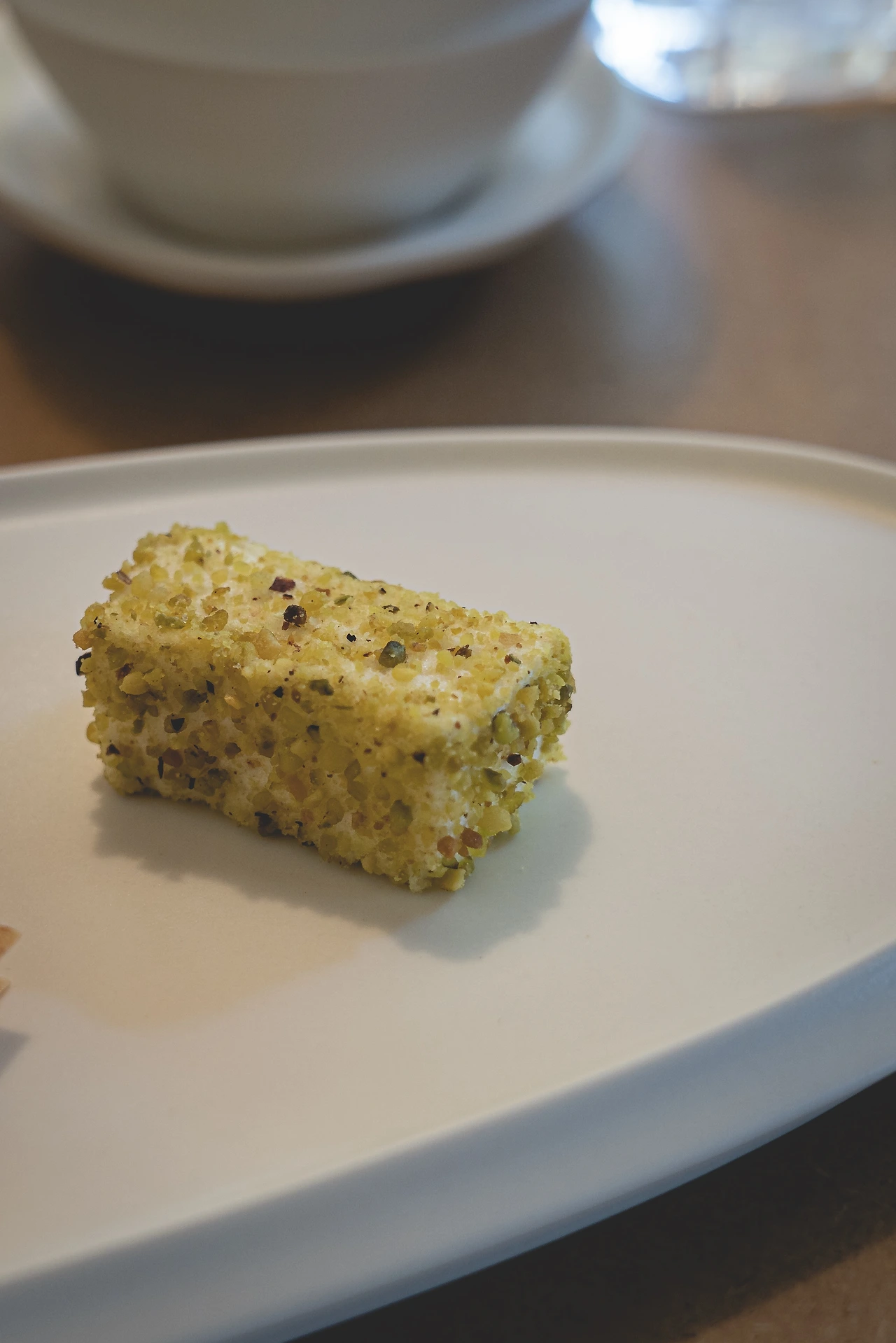 첫 번째로 먹게 되는 융드립 커피와 자스민 케이크는 개인적으로 셋 중 가장 좋았던 조합. 융드립답게 맛이 부드러우면서도 진한 것이 특징. 에스프레소를 연상시키면서도 그렇게 끝 맛이 쓰지는 않았다. 다크 초콜릿의 향이 풍부한 원두를 사용하셨는데 나의 경우에 이런 바디감이 있고 초콜릿 계열의 맛이 나는 커피를 선호하지 않는 이유가 바로 끝 맛이 너무 무거워서였었다. 그런데 이 드립은 추출 방식의 차이 때문인지 내가 먹기에도 참 거부감이 적어 가지고 있던 편견을 깨준 커피. 그래서 더 인상에 깊게 남았다. 같이 페어링 된 디저트인 자스민 케이크는 커피완 대조적인 자스민의 밝은 꽃 향이 특징적인 디저트. 겉을 감싼 머랭의 바삭한 식감, 달달한 맛과 크림의 부드러운 달콤함이 커피와 매력적으로 어우러지는 데다 머랭에 들어간 상큼한 패션후르츠의 향까지 더해지는 케이크였다. 알려주시기론 겉 부분의 하얀 머랭은 블루보틀 삼청점의 외관에서 그 영감을 얻으셨다고.