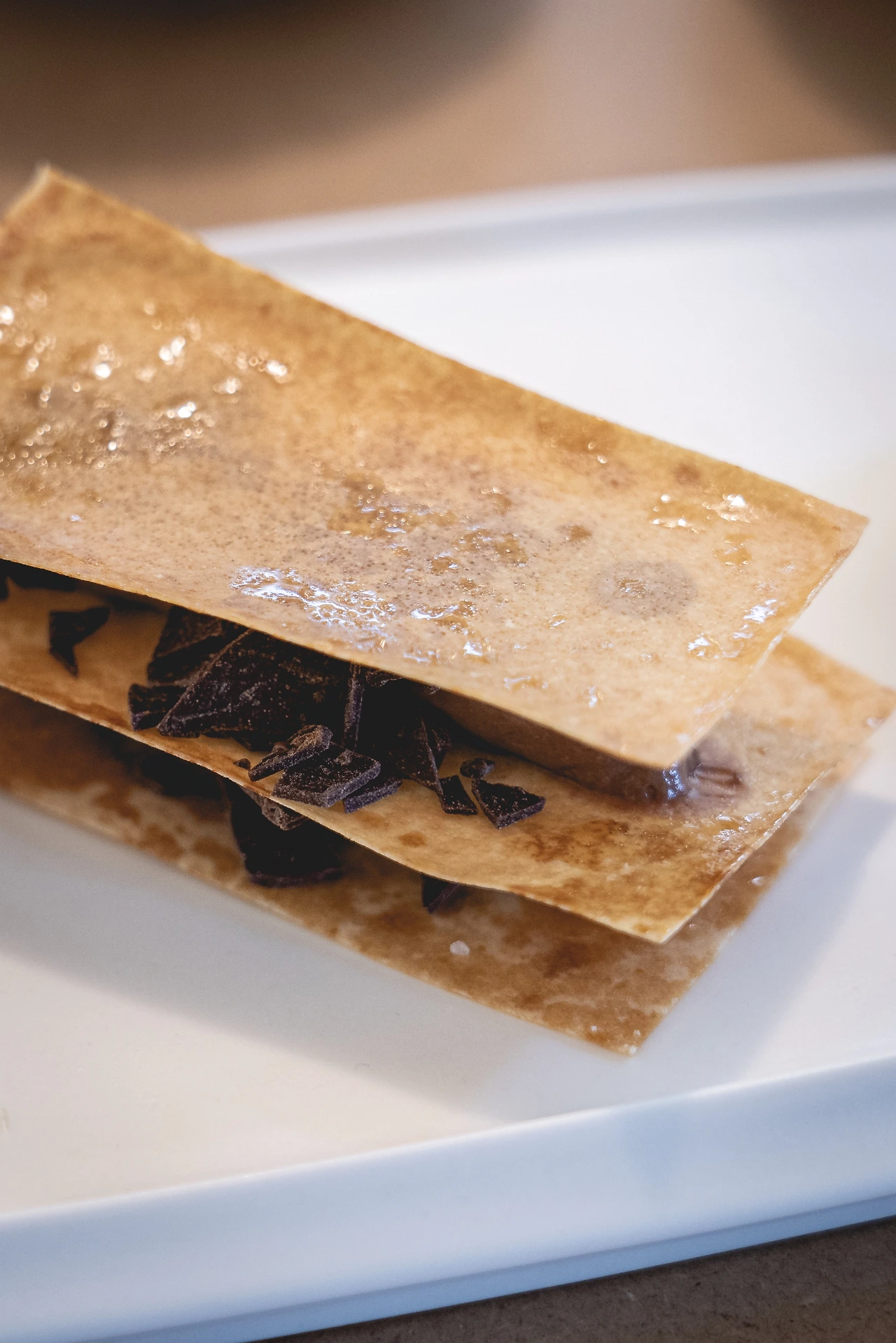 두 번째 메뉴는 토치로 위의 설탕을 태워 바삭한 텍스쳐를 만들어낸 음료, 놀라 크렘 브륄레와 역시 바삭한 페이스트리, 초코칩의 식감으로 궁합을 맞춘 쇼콜라 밀푀유. 식감적으로 먼저 그 재미를 즐겨보자. 놀라(NOLA)는 뉴올리언스를 뜻하는데, 바로 블루보틀의 시그니처 음료인 그 뉴올리언스를 말한다. 그래서 겉 부분의 크렘 브륄레 밑으로는 차가운 커피인 뉴올리언스가 들어가 있다. 직원분께서 설명해주셨는데 뉴올리언스 음료에는 치커리가 들어간다고 한다. 실제로 미국 뉴올리언스에서 치커리를 이용한 커피 음료를 마시기도 해서 블루보틀이 거기에서 착안한 것도 있다고. 미각이 예민한 분들이라면 치커리 풍미를 찾아낼 수 있으실 것이다. 뉴올리언스는 차가운 라떼와도 비슷하면서 약간의 단맛을 가진 음료. 더해지는 디저트인 밀푀유가 생각보다 많이 달지는 않고, 다크 초콜릿 계열의 산미 있고 묵직한 초콜릿 맛을 지녔기 때문에 역시 서로 조화롭게 어우러진다.