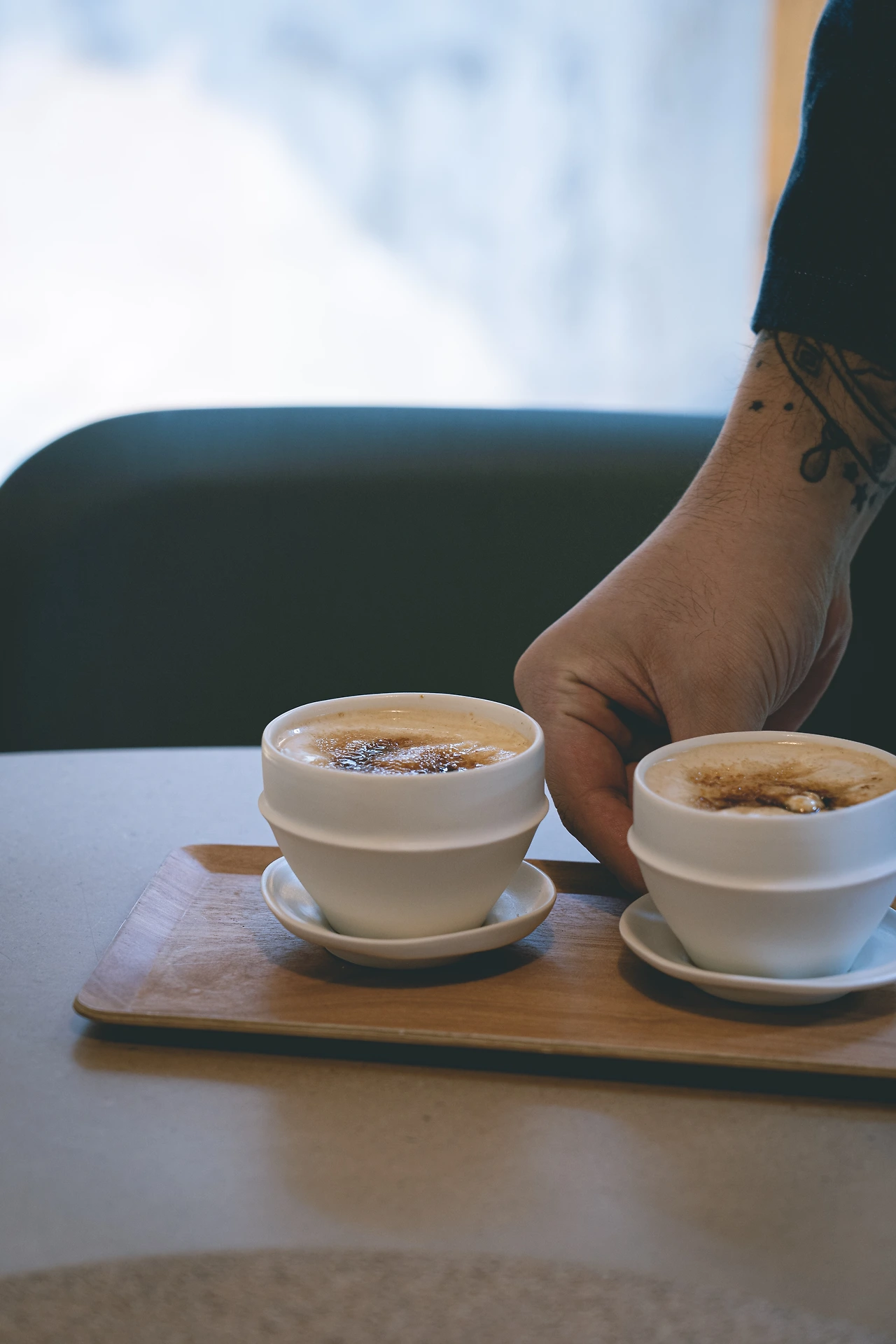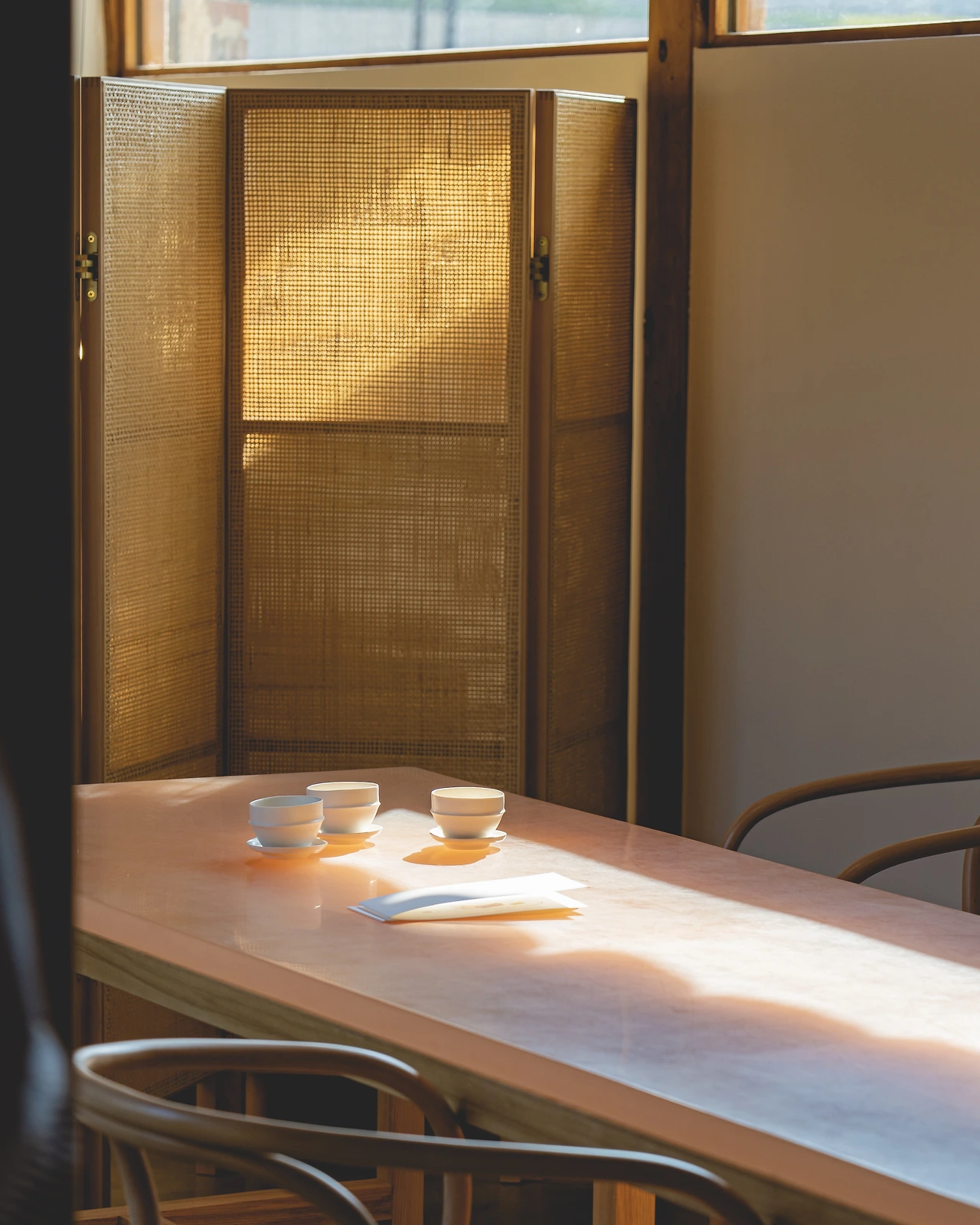 그리고 그 오른편, 입구에서 중앙 안쪽의 공간에는 커다란 4인 테이블이 놓여있는데, 크기상으론 6인도 충분히 가능해 보였다. 내가 들렀던 시간에는 2인 예약 두 팀이 같이 사용하고 있기도 했고. 테이블의 왼쪽에는 나무 병풍을 두어 중앙 공간을 왼쪽의 웨이팅 룸과 분리해 보다 프라이빗한 느낌을 살렸다. 뒤의 창을 통해 햇살이 아름답게 들어오는 것도 빼놓을 수 없는 부분.