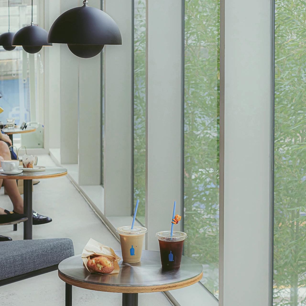 그리고 마지막으로 우리 일행이 둘러보고 앉았던 곳은 입구 오른쪽 공간. 중앙의 전등 밑으로 4명 정도가 앉기 적당한 원형 테이블이 자리를 잡았다. 여기의 의자에도 초록색이 눈에 들어온다. 역시 통유리 벽을 통해 햇살이 들어오는 공간. 그 뒤로는 블루보틀의 굿즈를 진열해놓은 모습이다. 따로 삼청점에 들르지 않고도 이렇게 볼 수 있으니 블루보틀의 굿즈에 관심 있으신 분들께는 이것 또한 쏠쏠한 요소.