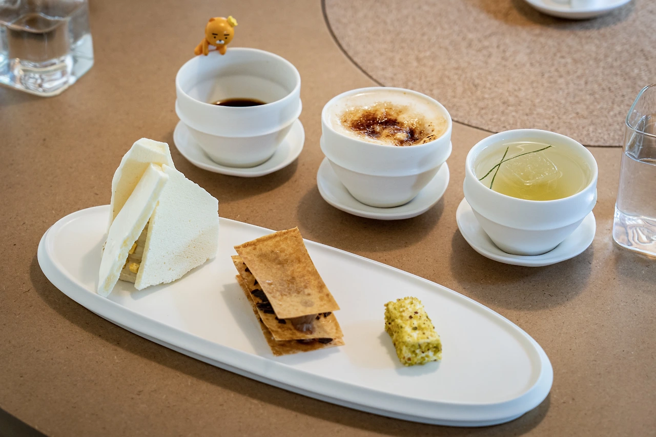 각 테이블에는 식기와 더불어 삼청 한옥점에 대한 소개와 음료, 디저트에 대한 설명이 적힌 종이가 놓여있는데, 종이가 세워진 모습이 어딘지 모르게 블루보틀 삼청점의 외형을 연상시킨다. 종이에 쓰인 내용과 별개로 음식과 음료를 서브받다 보면 직원분들이 하나하나 더 자세하게 설명해주시기 때문에 편하게 즐기다가 오면 된다.