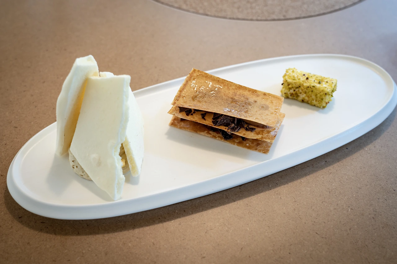 음식은 단일 세트라 다 같이 서브된다. 자스민 케이크 & 융드립 커피 / 밀푀유 쇼콜라 & 놀라 크렘 브륄레 / 기모브 피스타슈 & 솔 라임 피즈