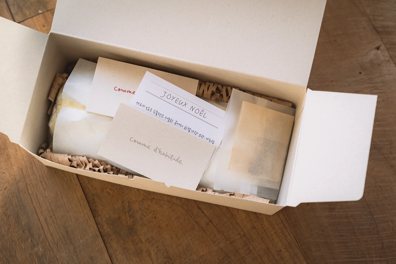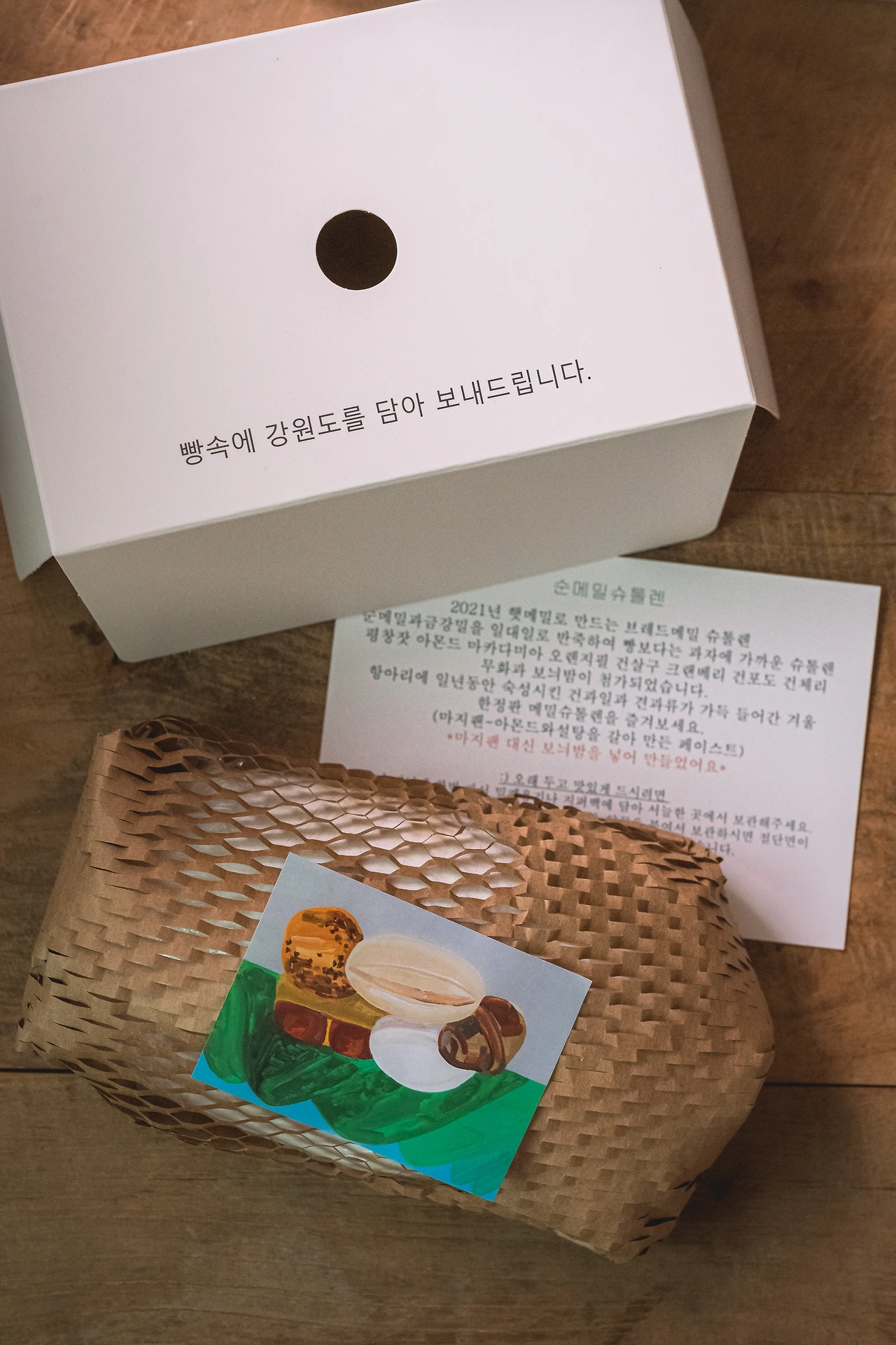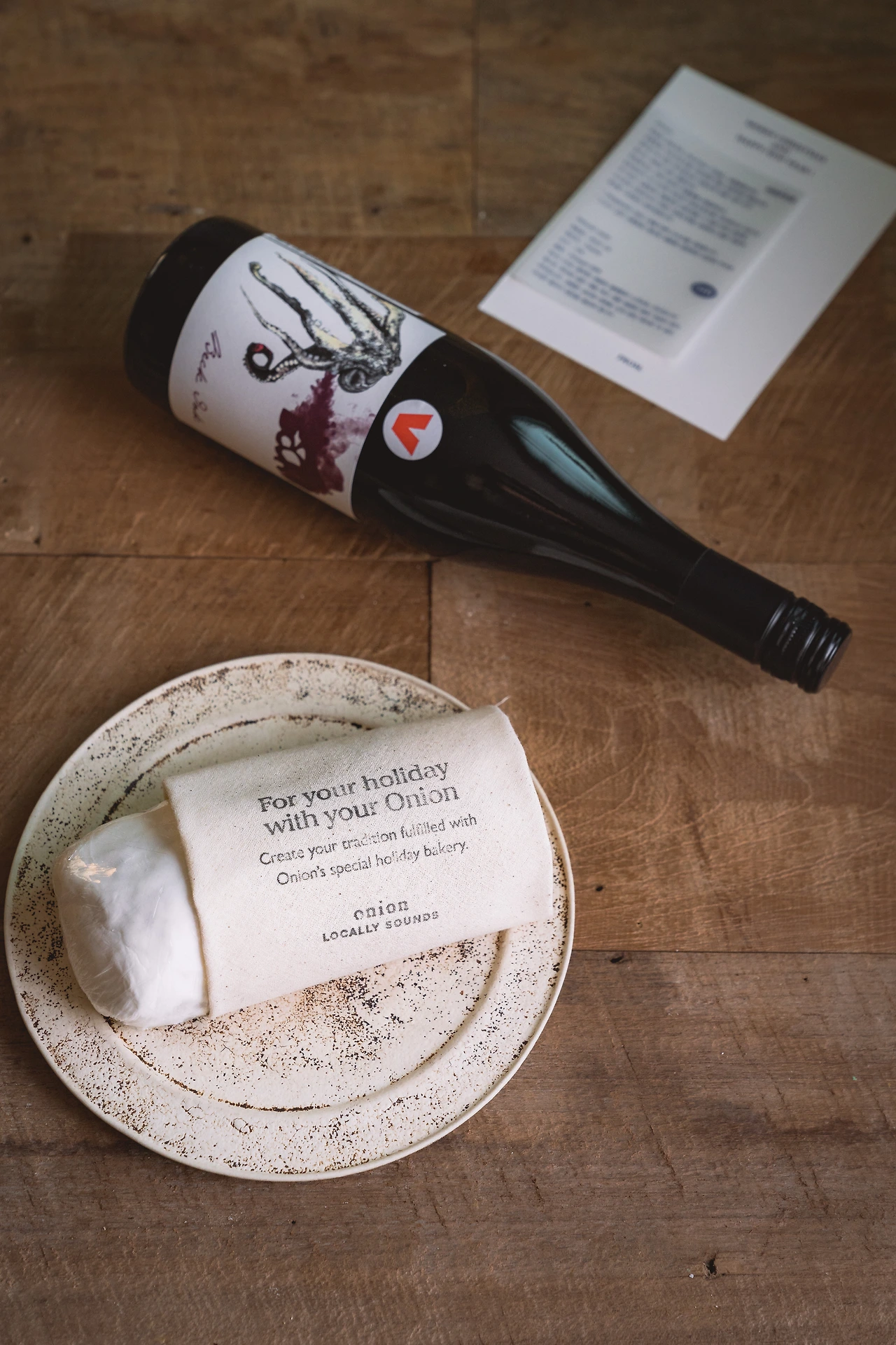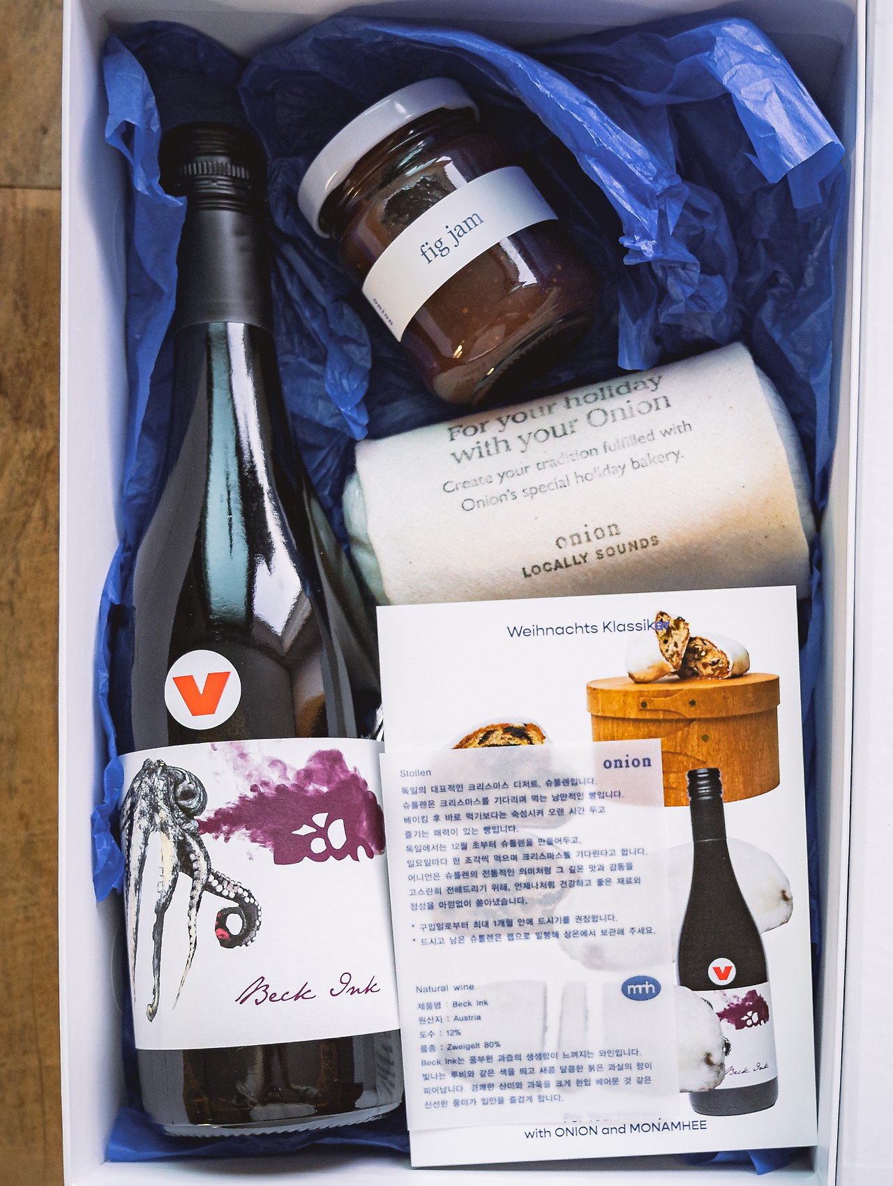 어니언의 슈톨렌에 무화과잼과 대구의 식료품 샵 모남희가 픽한 내추럴 레드 와인을 조합해 감각적인 패키징까지 곁들여서요.