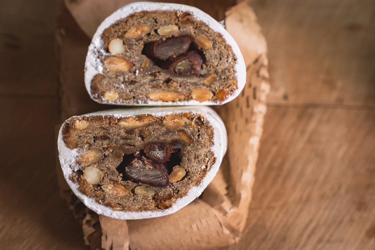 하얀 슈가파우더가 감싸 마치 소복하게 눈이 내린 모습을 떠올리게 하는 빵의 겉 부분과 동그랗게 박힌 마지판 주위로 과일과 견과류가 먹음직스럽게 보이는 큼지막한 단면.