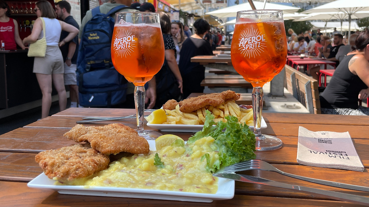 운이 좋게도 필름페스티벌의 마지막 날을 즐길 수 있었다. 알미언니의 도움으로 슈니첼에 감자샐러드까지 추가해서 주문 완료. 혼자였으면 꼼짝없이 옆 가게 명량핫도그를 먹었을 텐데.
