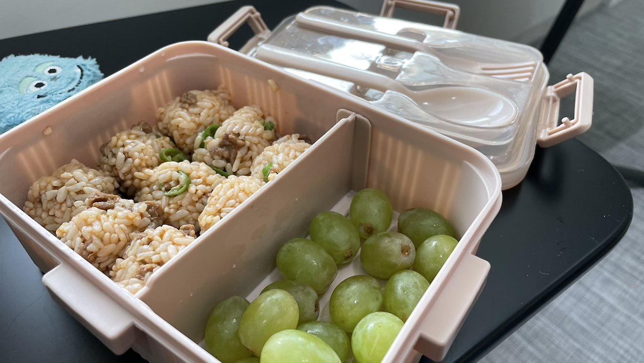 어제는 청양고추를 넣은 떡갈비김밥을 먹었고, 오늘은 똑같은 메뉴로 떡갈비주먹밥을 만들었어요. 심지어 청포도까지 챙겨서요. 정말 맛있습니다. 겉으로 보기에는 밥도 많고 싱거워 보이지만 감칠맛이 호롤롤로 라고요! 저 정말 일품 요리사가 되어가고 있습니다. 도시락의 포인트는 냄새가 나지 않으면서 반나절동안 냉장고에 있지 않아도 상하지 않을 것. 또한 전자레인지에 뎁히지 않고 미지근하게 먹어도 맛있을 것. 은근 고려해야 할 것이 많지요? 그런 의미로 냄새가 강한 찌개와 카레는 탈락입니다. 불어버리는 면도 탈락이고요. 식으면 굳어버리는 떡볶이도 탈락입니다.