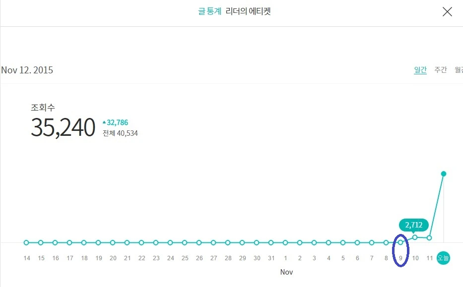 브런치: 11/9일 128회 --> 10일 2,712회 --> 11일 2,454회 --> 12일 35,240회