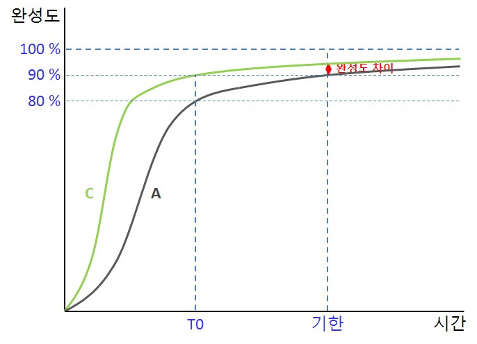 만약 자신의 기본 역량이 이미 갖춰져 있고 경력도 있는 분야의 업무라면 당연히 동일한 시간 내에 더 높은 완성도를 달성할 수 있다. 다음 그림은 일하는 속도는 같은데 경험이 쌓여 있어서 동일한 T0 시간 내에 도달할 수 있는 완성도가 90%인 예를 보여준다. 즉, 그림의 C와 같은 경력자라면 90% 완성도까지 1주일(=T0)이 소요되고, 95%까지 2주, 97.5%까지 4주가 소요될 것이다. 같은 수준의 완성도에 대해서 A에 비하여 반 밖에는 시간이 소요되지 않는다. 즉, 경험을 통해 기본 역량을 쌓는 것이 주어진 시간 내에 일의 완성도를 높이는 데에 매우 중요한 요소라고 볼 수 있다. 따라서, 자신이 일을 잘하는 사람이 되고 싶다면 자신의 직무에 대해서 경력을 쌓는데 노력을 게을리해서는 안된다는 결론을 내릴 수 있다.