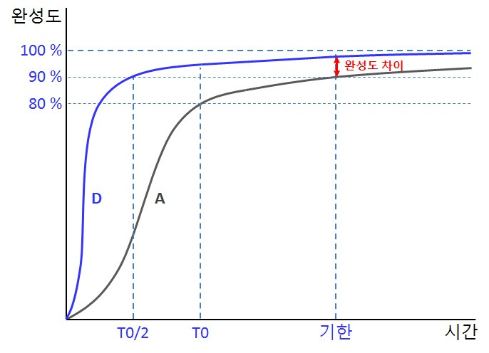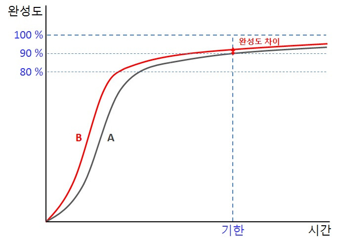 기한 내에 완성도를 높이려면 어떻게 해야 할까? 당연히 일하는 스피드를 높이는 방법 밖에는 없을 것이다. 일하는 스피드를 높이는 방법은 여러 가지가 있을 수 있겠지만, 다른 사람의 결과를 베끼거나 대충 비슷한 내용을 짜깁기하는 방법은 추천하지 않는다. 물론 스피드를 높일 수는 있으나 업무의 단계가 높아질수록 점차 사용할 수 없는 방법이 된다. 추천하는 방법은 공부를 통해 기본 역량부터 높이고 나서 본격적으로 업무를 시작하는 것이다. 기본 역량 높이는 시간 때문에 오히려 기한을 넘길 것 같지만, 생각보다 대부분의 일들이 필요로 하는 기본 역량을 습득하는데 시간이 많이 걸리지 않는다. 대부분은 지레 겁먹고 시도조차 하지 않는 경우가 많다. 기본 역량을 쌓은 후 본격적으로 업무를 시작해도 아래의 그림에서 보는 것처럼 A에서 B와 같은 곡선으로 스피드를 당기는 것이 가능한 경우가 대부분이다.