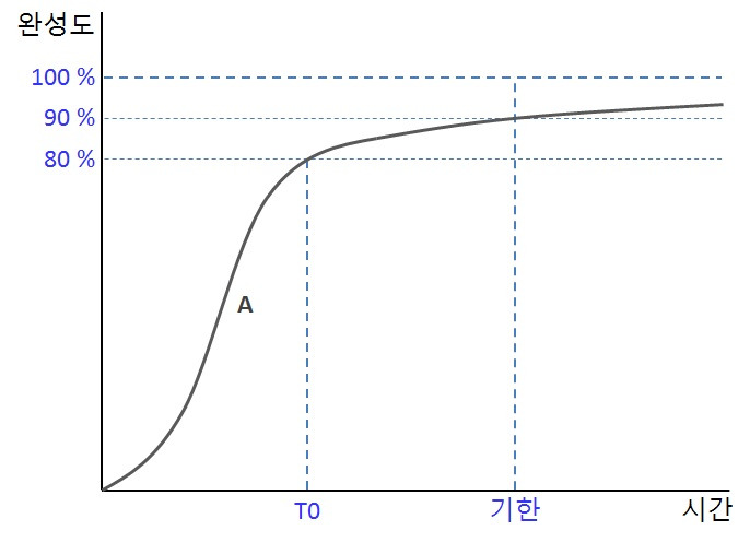 가장 바람직한 일에 대한 완성도 곡선은 다음과 같을 것이다. 경력이 쌓여 있고 일을 진행하는 스피드도 빨라져서 90% 완성도까지의 소요 시간도 ½주(=T0/2) 밖에 걸리지 않고, 95%까지는 1주, 97.5% 완성도까지는 2주 밖에는 걸리지 않는 경우이다.