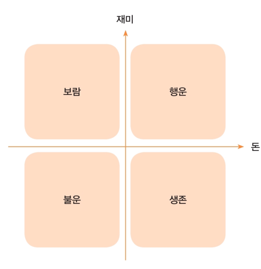 그래프를 보면서 지금 자신이 어디에 있는지 생각해보세요. 저는 ‘처음엔 무조건 위로 올라간다, 그다음엔 앞으로 나아간다’라는 목표를 세웠어요. 재미를 찾는 게 우선입니다. 살아보니까 재미난 일을 열심히 하면 돈은 따라오더군요.