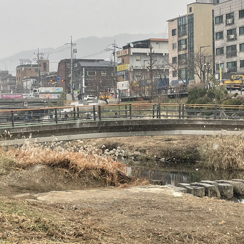 배가 터질 것 같기도 하고 적지 않게 내리는 눈도 계속 보고 싶어 천을 따라 한 정거장 정도 걸었다. 부산에 사는 나에게는 그 어느 때보다 진귀한 풍경이다. 보통 눈이 많이 내리는 지역의 거주민들은 눈 오는 날을 썩 반가워하지 않던데, 내내 부산에 살면 눈에 대한 낭만을 잃지 않을 수 있다는 큰 장점이 있다.