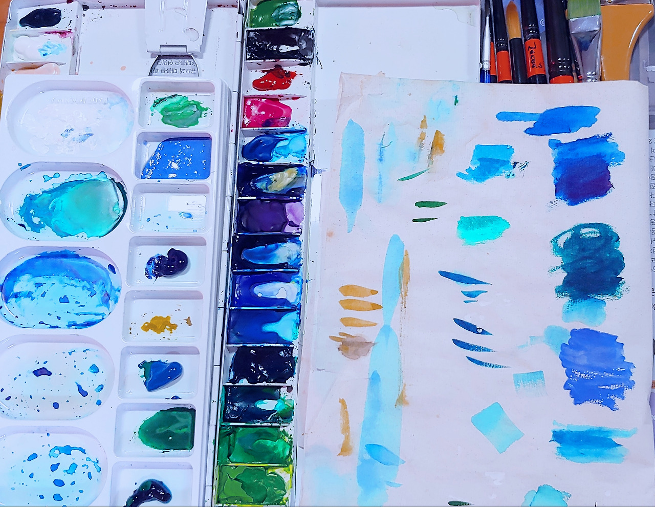 파도, 바다, 구름이 주로 등장한다. 그러다보니 붓도 테스트지도 물통도 다 파랗게 파랗게 물들었다~
