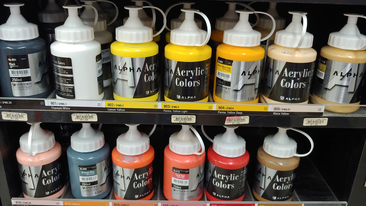 요즘은 파도 물보라 표현에 진심이기 때문에 이에 도움되는 도구들을 마련하기 위해 코너코너를 찬찬히 둘러봤다. 아크릴 물감이나 유화 쪽은 도전해보고 싶긴 한데 왠지 실험실을 차려야 할 분위기라 일단 가격대만 확인해두고 마스킹고무액과 포스카마카, 수정액, 젤리펜까지 죄다 화이트로 구매했다. 물감은 터쿠아즈 블루, 버디터 블루, 마린 블루, 프러시안 그린을 샀다.