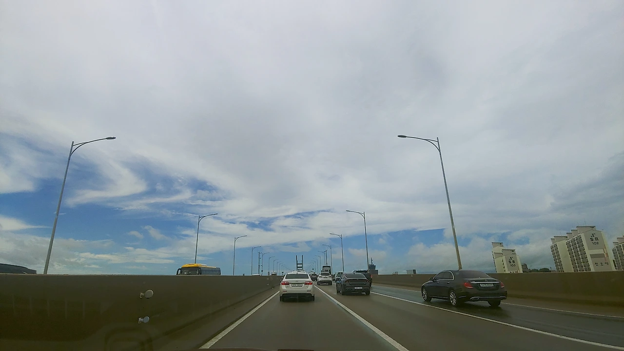평택항을 지날땐 폭우가 쏟아져서 제법 큰 차인 우리차도 비바람에 흔들릴 정도였는데 그 구간을 지나가니 갑자기 윈도우 바탕화면급의 청량한 하늘이 눈앞에 펼쳐졌다.