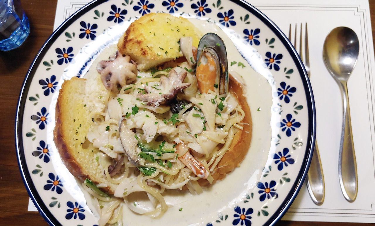 이런 빠네파스타는 처음이었다. 양은 거의 2인분에 해물도 엄청 많이 들어갔고 적당히 매콤한 로제크림에 빵은 버터리하고 겉바속촉이라 술술 넘어갔다.