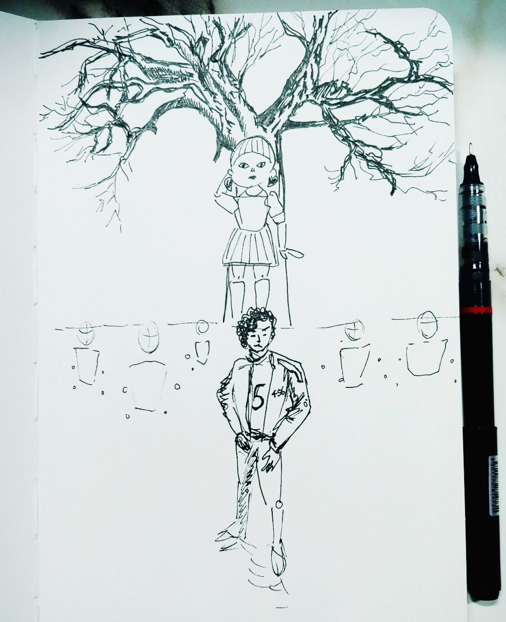 처음엔 저 무서운 거대 영희 모형 그리고, 나무 뼈대 그리고...(뼈대만 그릴랬는데 또 정성이 들어가버렸...) 이정재 먼저 그리다가.... 헤어스타일 얹는데서 열정의 뽀글이 스킬을 시전 해버렸다.