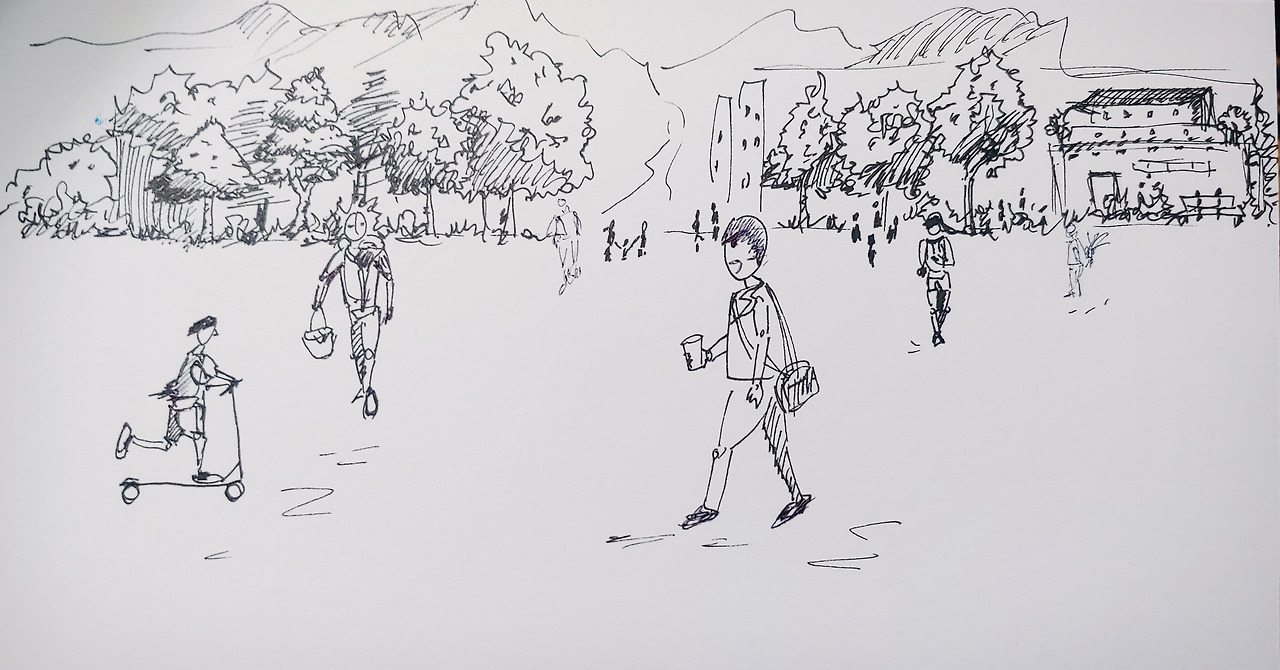 사람 그리기는 왠지 비율이나 그런 게 어려워서 잘 안 그려졌다. 컨투어 드로잉을 알고 나서 그나마 우리 집 아이들 대상으로 한 선 이어 그리기를 해보긴 했던 게 다였다. 있는 그 자리에서(여행지에서) 눈앞에 보이는 풍경을 빠르게(약 5~10분) 캐치해 그리는 스케치에서 사람이라는 디테일을 그려 넣기란 여간 겁나는 일이 아니었다.