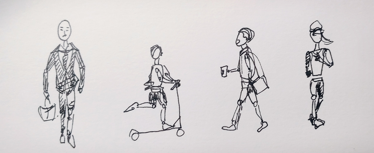 지난 수요일 드로잉프렌즈 클래스 주제는 '포즈 드로잉'이었다. 어반 스케치를 하는 데 있어서 어디 풍경이든 사람들은 꼭 지나가니까, 사람을 그려 넣는 건 그림의 역동감과 생동감을 살리는데 도움이 된다.