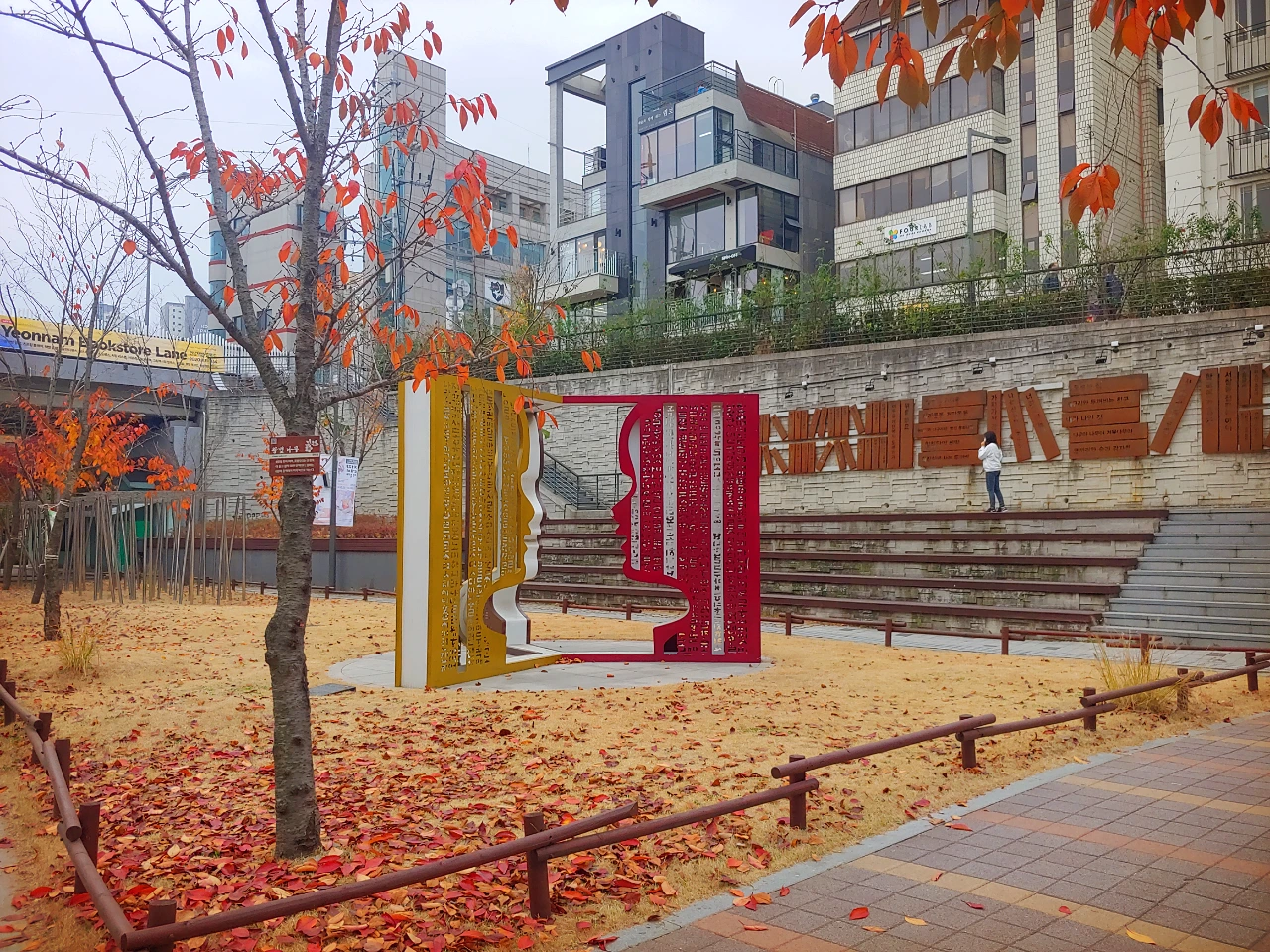 이 와중에 우리 주변의 정취는 빠알갛게 마지막 열정을 불사르고 있었다. 벚나무는 봄에도 가을에도 이렇게 곱구나. 책거리 답게 컨테이너 속 문화책방들과 전시공간은 아늑한 아름다움이 있었다.