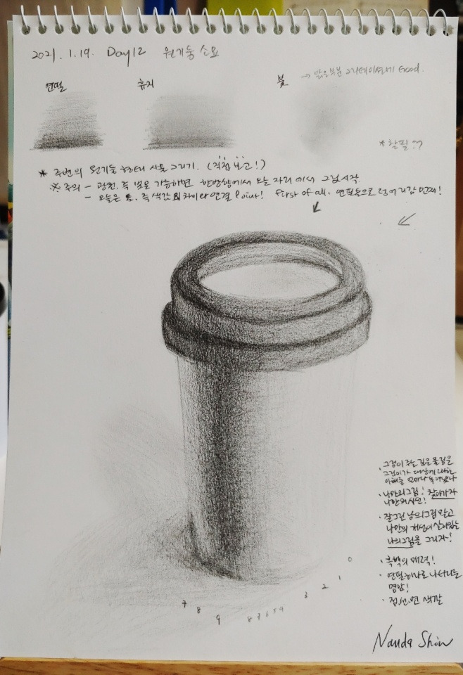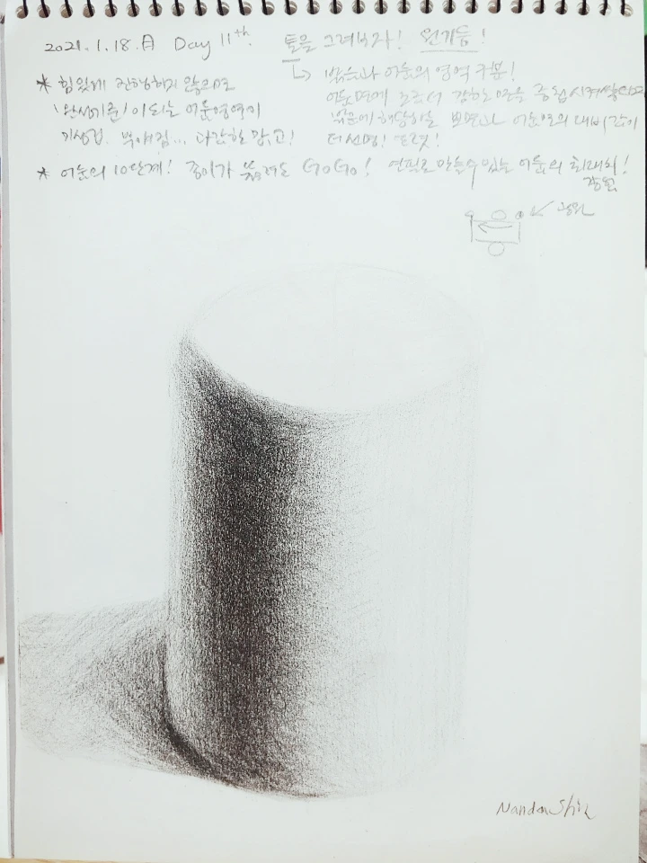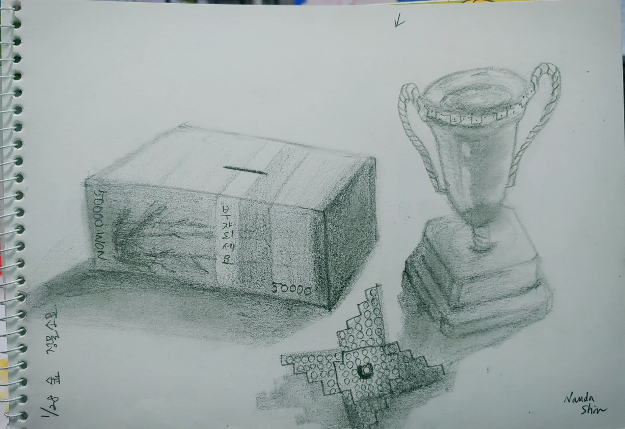 그럼에도 불구하고 이런 과정을 통해 나는 손아귀에 힘이 생겼고, 선의 강약조절이라는 미묘한 즐거움을 찾았으며, 흑연 뿐 아니라 지우개나 휴지를 통한 번짐효과도 시도해볼 수 있었다.