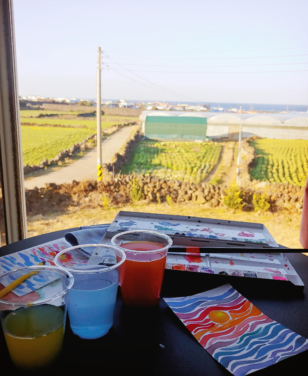 제주2주살기하러 오기 전, 온라인 드로잉 클래스의 컬러섹션1이 시작되었다. 수채화 물 조절 연습도 해보고 명도 연습도 해보고 풍경화도 그리며 그 물맛에 푹 빠졌다. 설 지나고 다시 시작하는 컬러섹션 과제를 놓치고 싶지 않아 제주까지 물감파레트며 물통, 붓 등 수채도구를 바리바리 싸들고 왔다.