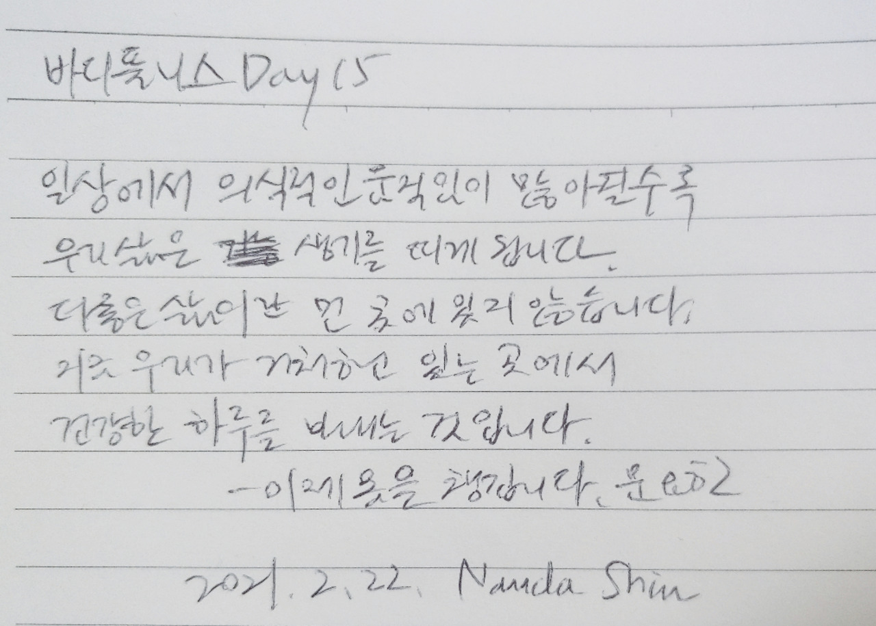 매일 몸챙김 마음챙김 바디풀니스 프로그램을 참여한지 15일째. 이틀은 빼먹었지만 매일 안하면 허전할 정도로 내 일상의 루틴이 되고 있다.