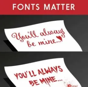 앞서 말한 디자인력과 색채디자인, 그다음으로 중요한 것은 바로 서체이다. 인터넷에 돌아다니는 이미지 중에 서체의 중요성을 잘 보여주는 짤 하나가 있다. 인터넷에 '서체의 중요성'이라고 검색하면 "YOU'LL ALWAYS BE MINE..." 이라는 문구가 2가지 서체로 쓰여있는 것을 볼 수 있다. 빨간색 글씨로 하나는 귀여운 필기체로 쓰여 있고, 하나는 호러틱한 손글씨 서체로 쓰여있다. 같은 문구라도 어떤 서체를 선택하느냐에 따라 그 분위기가 반전되는 것 알 수 있다. 그렇기 때문에 서체를 고를 때 제작할 디자인이 어떤 분위기여야 하는지에 따라 선택해야 하는 서체 종류가 달라질 수 있다. 그렇다면 서체는 어떻게 선택해야 할까?