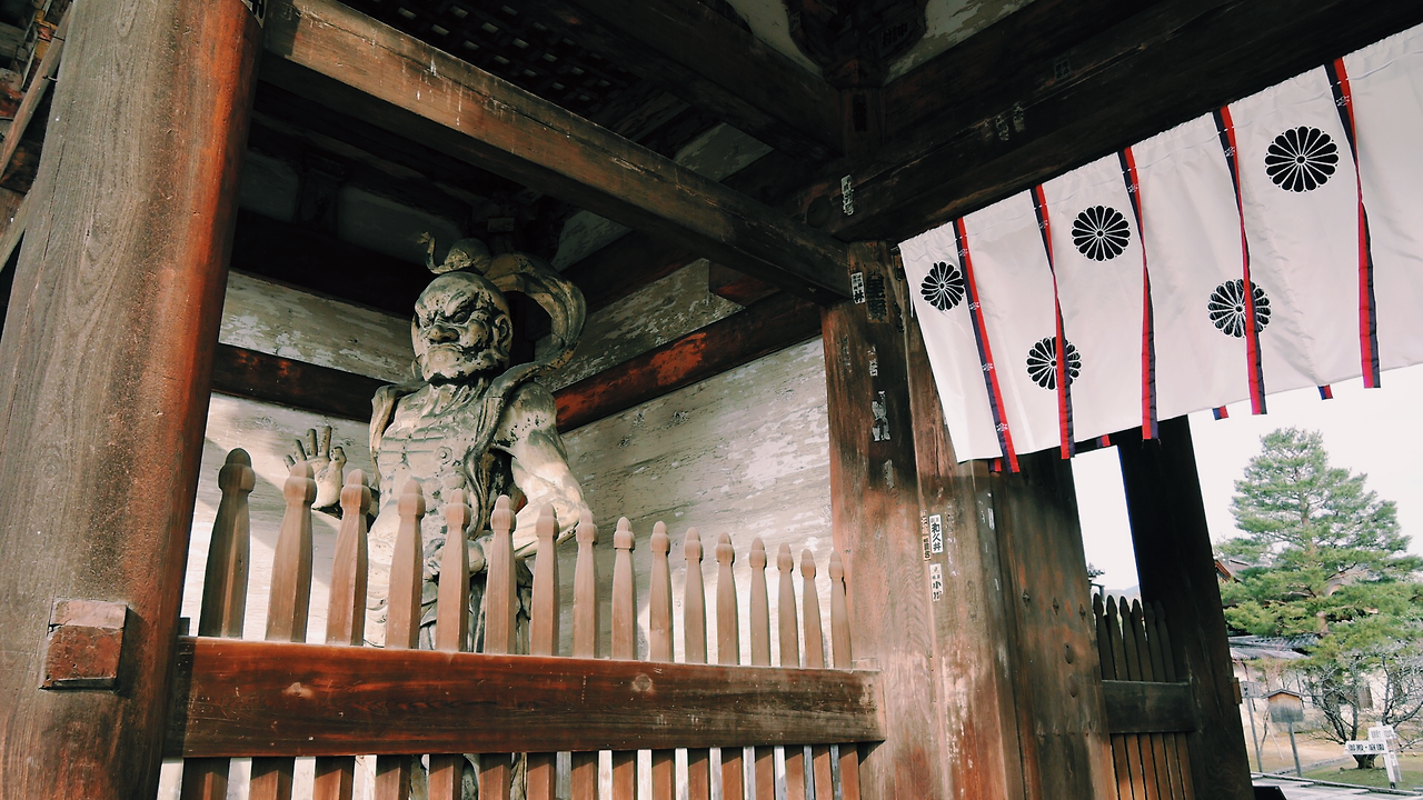 처음엔 료칸에서 마련해 준 송영버스를 타고 JR하나조노역에서 일정을 시작할 참이었다. 거기서 버스를 타고 가와라마치역까지 가면 코인 락커에 짐을 보관할 수 있다. 그런데 료칸 안내원이 '닌나지'에 내려줄 테니 거기서 버스를 타라고 다시 일러주었다. 덕분에 계획에 없던 신사를 보고 일정을 시작했다.