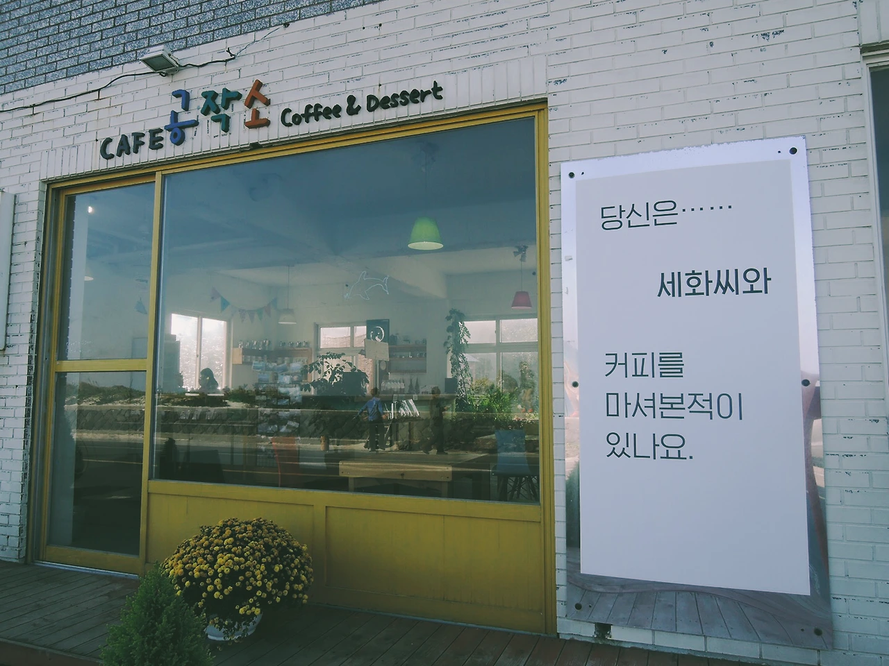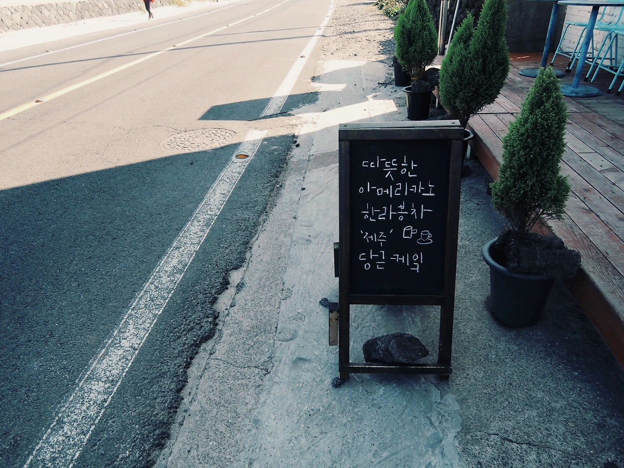 (ⓒ 2015 NOODLE / 바다 앞에 자리 잡은 카페공작소. 메뉴를 소개하는 글씨가 참 예쁘다.)