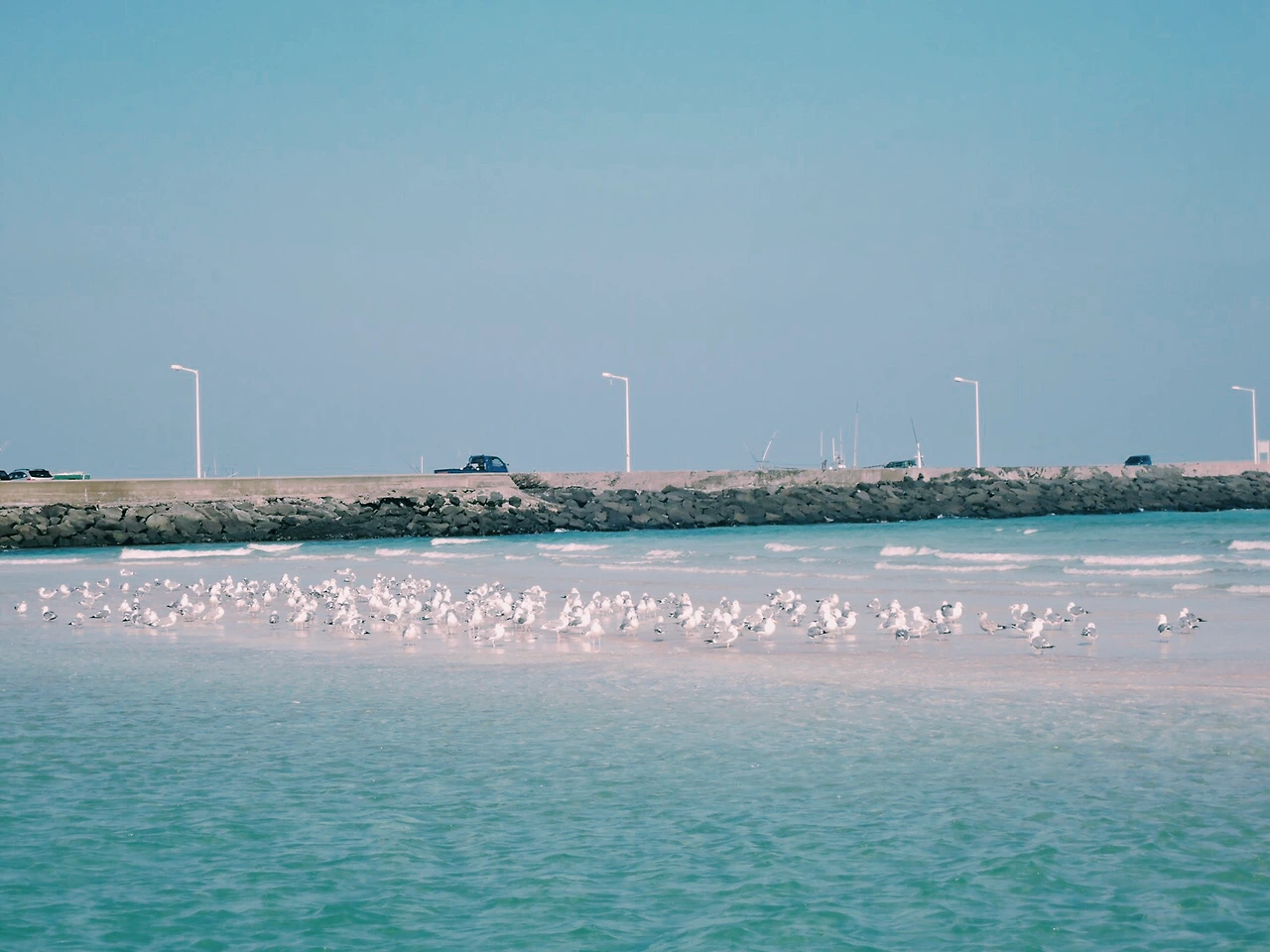(ⓒ 2015 NOODLE / 썰물이라 물이 빠진 세화바당 하얀 모래 위에 그보다 더 흰 갈매기들이 떼를 지어 앉았다.)