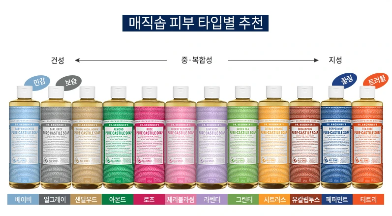 플라스틱 사용을 줄이기 위해 욕실/청소 용품을 올인원으로 바꾸기로 결심한 당신! 친환경적이면서도 다용도였으면 좋겠고 때에 따라 바꿔 쓸 수 있게 종류도 다양했으면 좋겠다. 그런 당신에게 닥터 브로너스를 추천한다. 닥터 브로너스 (Dr. Bronner's)는 1948에 설립한 미국의 유기농 스킨 & 바디케어 브랜드이다. 가장 판매량이 높은 제품은 역시나 캐스틸 솝. 고체와 액체 두 가지 타입이 있는데 다용도로 쓰기에는 액체가 편하다. 액체 비누 제품에 사용되는 플라스틱 용기는 100% 재활용 플라스틱으로 만들어져서 플라스틱-프리 라이프를 지향하는 우리에게도 죄책감을 덜어준다. 또 화장품 회사들이 흔히 하는 동물 실험 또한 하지 않고 제품에 동물성 성분을 사용하지 않는다. 그밖에도 기업 차원에서 여러 환경 보호 운동을 하고 있다고 하니 안심이다.
