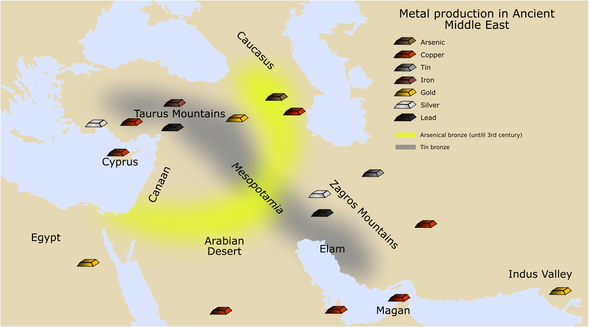 그런데 앞서 언급한 것처럼 자원은 매우 불균등하게 분포되어 있다. 위의 그림을 살펴보면 좀 더 이해가 갈 것이다. 고대 중동에서 구리(Copper)는 꽤 여러 곳에서 생산되고 있지만 주석(Tin)이 생산되는 곳은 한군데에 불과하다. 환경의 차이 또한 자원 불균형 분포의 원인이 되기도 한다.
