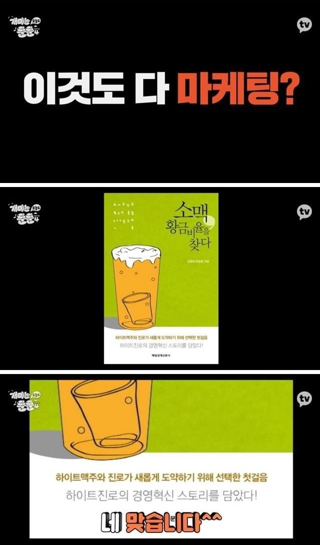 방송에선 이 내용을 컨펌하기 위해 "소맥, 황금비율을 찾다"라는 책 제목과 표지문구를 보여주며 사실이라고 했지만 실은 그 책은 소맥에 대한 얘기가 아니라 2011년 하이트진로 통합 법인 탄생에 관한 이야기다. 그걸 맥주(하이트)와 소주(진로)를 섞는 황금비율로 비유한 것이 제목일 뿐 이 표지는 소맥을 하이트진로가 만들었다는 것이 사실임을 증명하지 못한다.