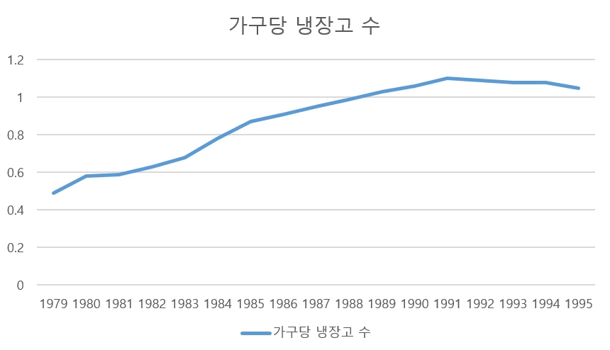 80년대에 빠르게 만두가 산업이 되었던 건 단순한 이유 때문입니다. 80년대에 냉장고의 보급이 완료되었거든요. 79년에 가구당 0.49대였던게 10년 후인 89년엔 1.03대를 기록합니다. 그 이전엔 냉장고가 제대로 보급되지 않아 탄생조차 할 수 없었던 상품이 냉장고의 빠른 보급세에 맞춰서 등장할 수 있었던거죠.