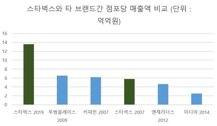 실제로도 그렇습니다. 스타벅스의 점포당 매출이 가장 안좋았던 시기는 2007년입니다. 그런데 다른 브랜드들은 가장 잘됐던 시기가 스타벅스의 가장 안좋았던 시기랑 비슷한 정도입니다.